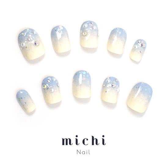 プリンセスのような美しさが感じられる水色のグラデネイル。散りばめられたパールとストーンが指先でキラキラと輝きます。ベースがクリームカラーなので、肌なじみが良いのも魅力です。秋冬のデートや結婚式のお呼ばれなどで活躍するネイルチップです。