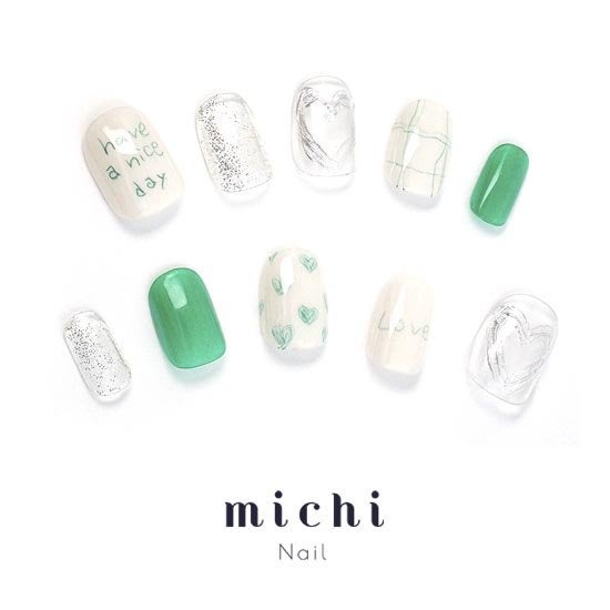 鮮やかなグリーンカラーが目を惹く落書きネイル。水彩鉛筆でアートした手描き感がほっこりするデザインです。普段グリーンを選ばない方も、ネイルチップなら気軽に挑戦できます。ホワイトべ―スで主張しすぎないデザインなので、普段使いしやすいもの魅力です。