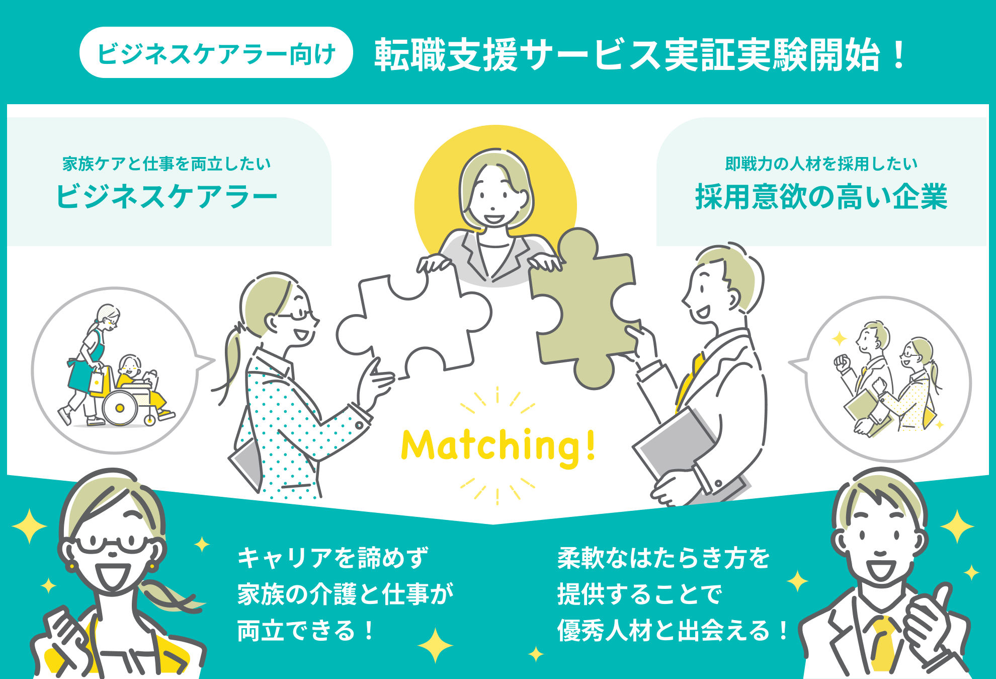 ビジネスケアラーは家族の介護と両立できるはたらきやすい環境を求めており、一方企業側もコロナ禍を経て人材獲得のためにはたらきやすさを訴求する動きが出てきております。そこで今回、ビジネスケアラーの採用に前向きな企業と、家族の介護と両立できるはたらきやすい企業を探す転職希望者をマッチングさせ、両者の課題解決を図ると同時に、今後ますます深刻化していく社会問題に対して、“介護しながらはたらく”という新しいスタイルを社会全体に普及させていきたいと考えました。