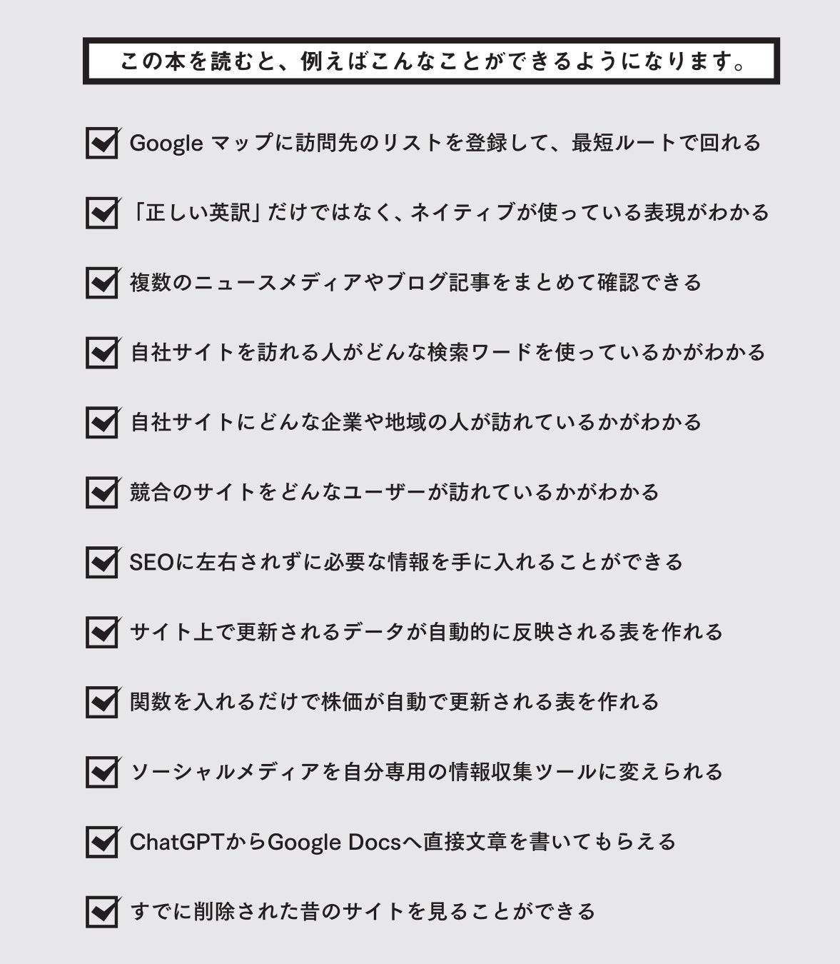 例えば「何が売れるか?」はGoogleの通常検索ではわかりませんし、競合が知らない、顧客も思い付かない情報を手に入れなければ人と違う仕事はできません。本書で紹介する「自分の欲しい情報を効率的に収集できるツール」はすべての仕事を劇的に加速させます。まさに、現代人必携の1冊です。