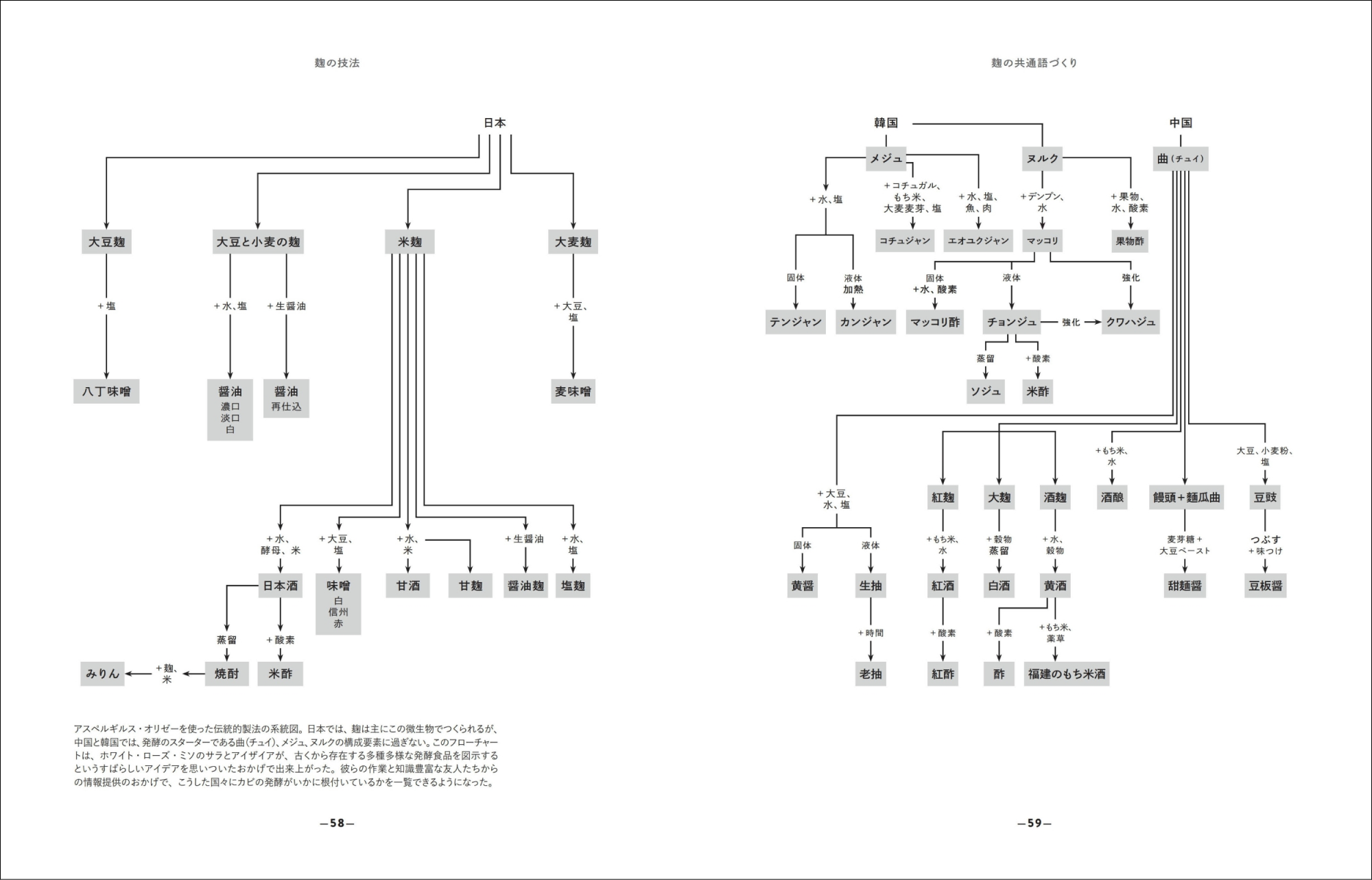 日本の麹は主にアスベルギルス・オリゼーでつくられますが、中国と韓国では、発酵スターターである曲(チュイ)、メジュ、ヌルクに含まれる微生物のひとつにすぎません。この系統図で、国々にカビの発酵がいかに根付いているかを一覧することができます。