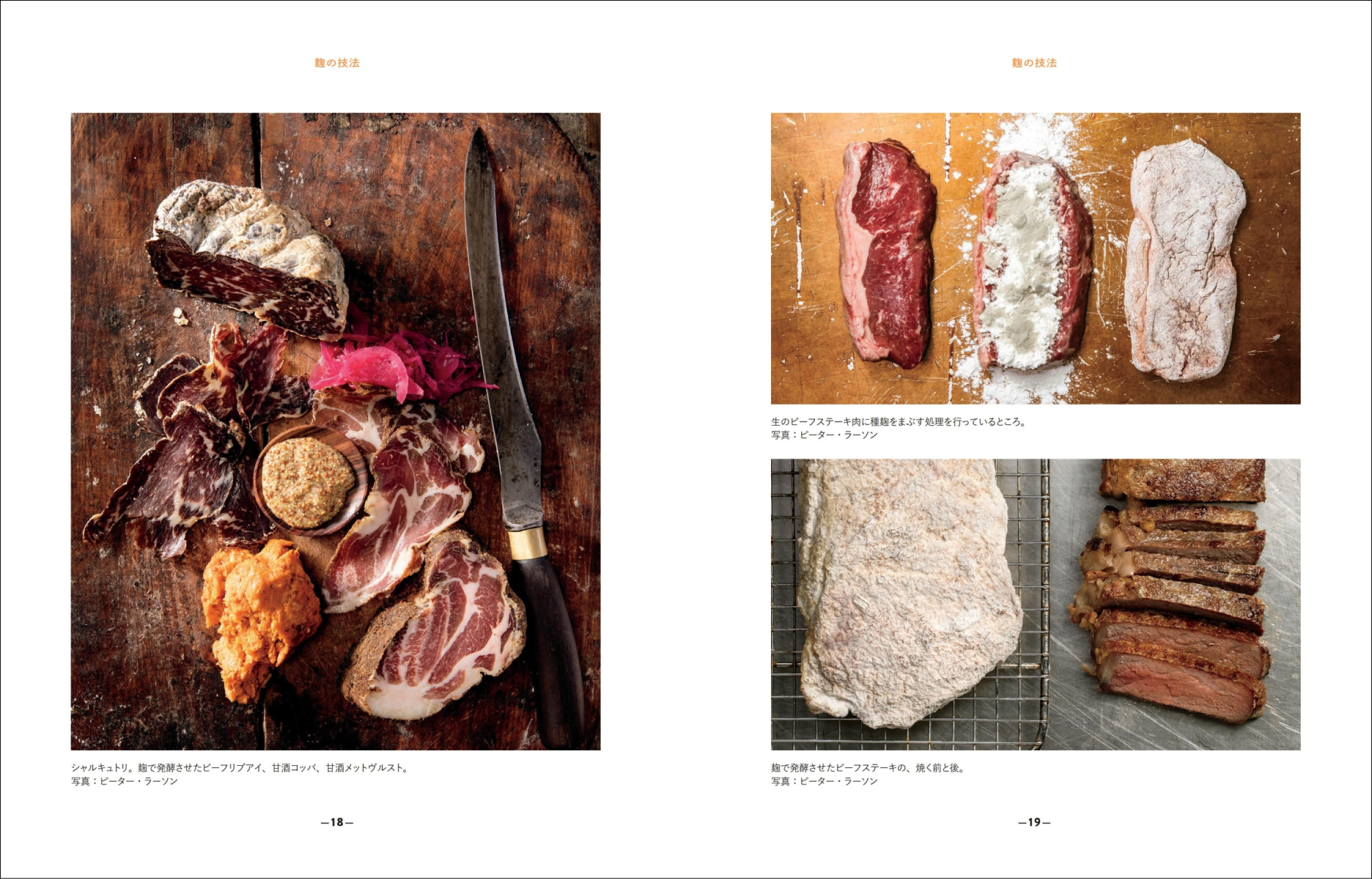 左:シャルキュトリ。麹で発酵させたビーフリブアイ、甘酒コッパ、甘酒メットヴルスト。