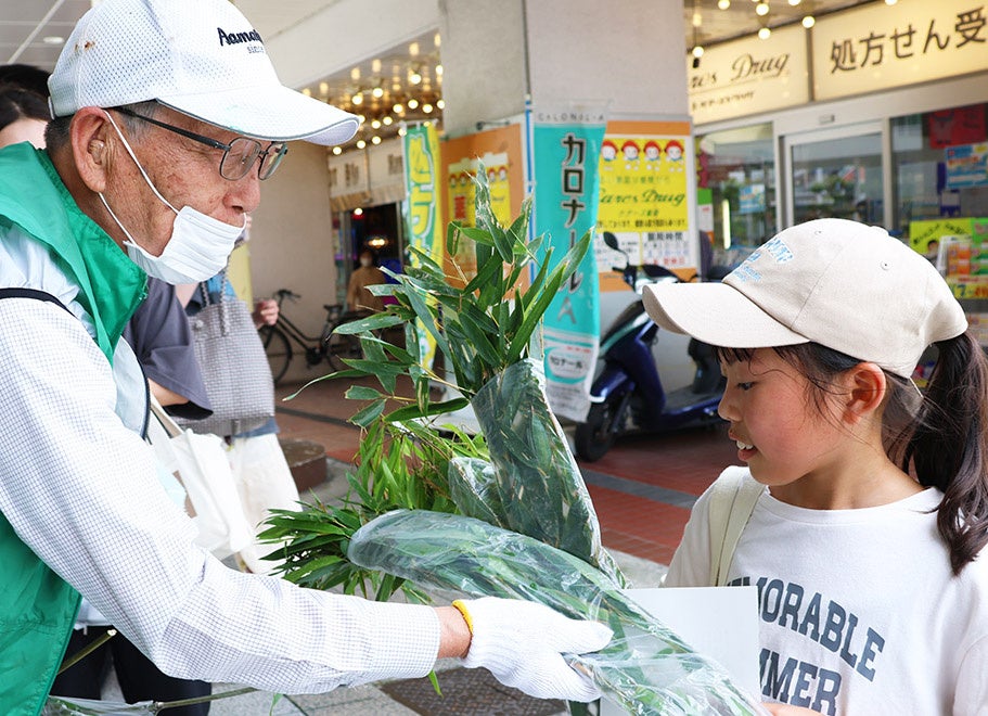 令和6年7月4日(木曜日)、高槻市と森林ボランティア団体の高槻里山ネットワーク、NEXCO西日本の3団体が市民らに里山を守る取り組みを知ってもらい、夏を彩る一大イベントの七夕を楽しんでもらうため、JR高槻駅前で間伐材を利用したササ約1000本を無料配布しました。