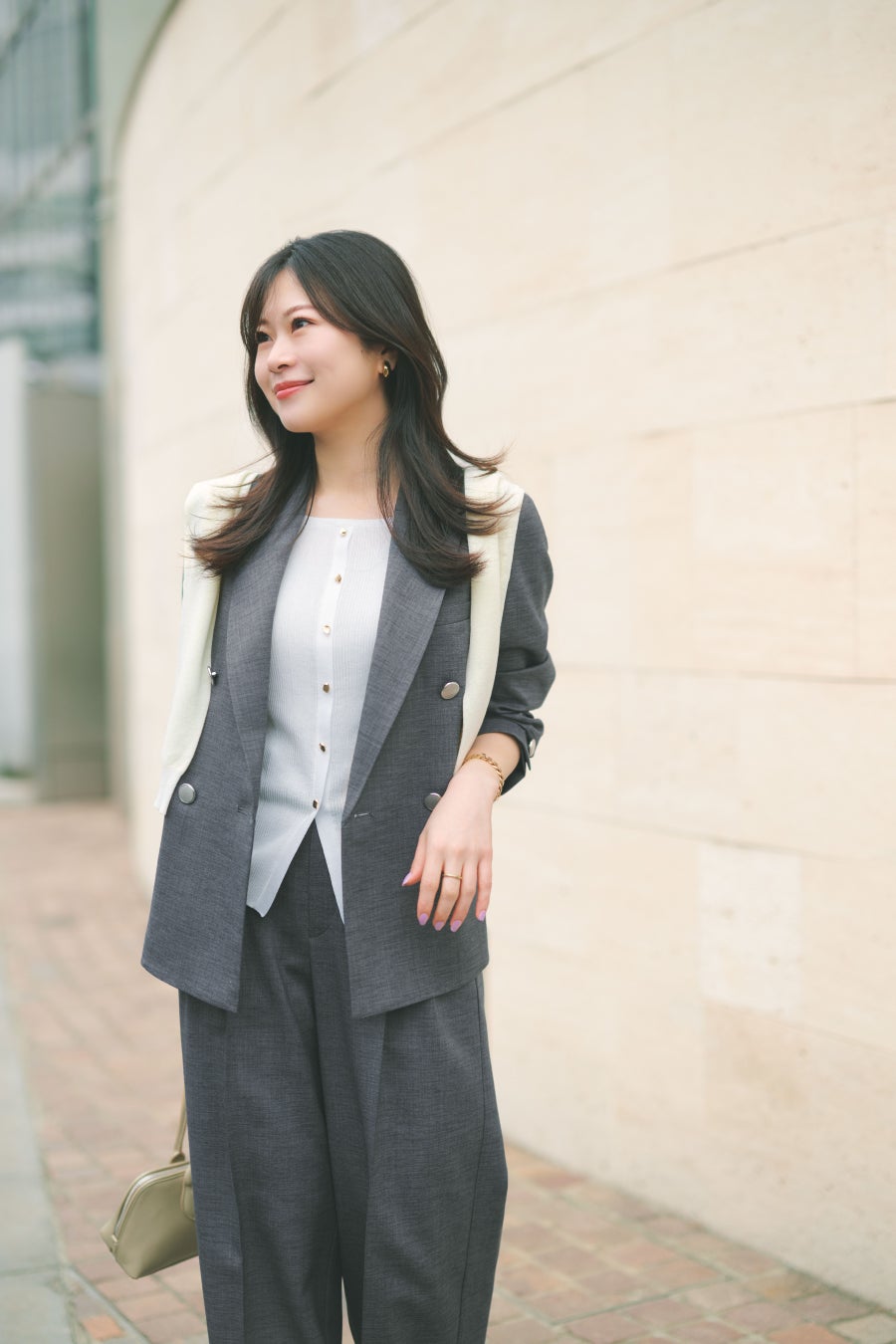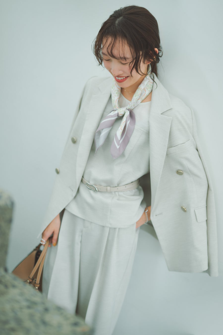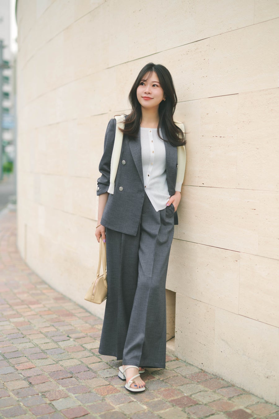 ジャケット+ワイドパンツの綺麗め王道セットアップスタイルには、ラフにニットを肩掛けして抜け感と差し色をプラス。