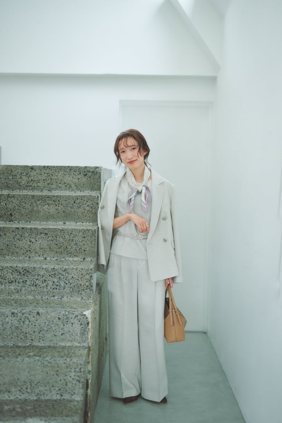 3点セットで着たスタイリングも、どこかこなれ感漂う仕上がりに。ベーシックカラーだからこそ、ブラウスのベルトを付け替えたり、小物でアクセントを足したりとアレンジを無限大に楽しめる。