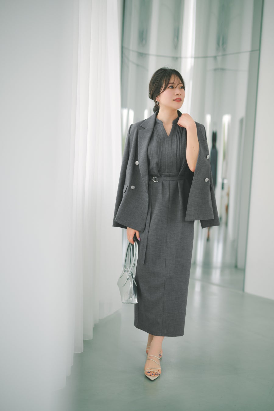 端正なジャケットとワンピースの組み合わせで、着るだけできちんと感と女性らしさを両立。