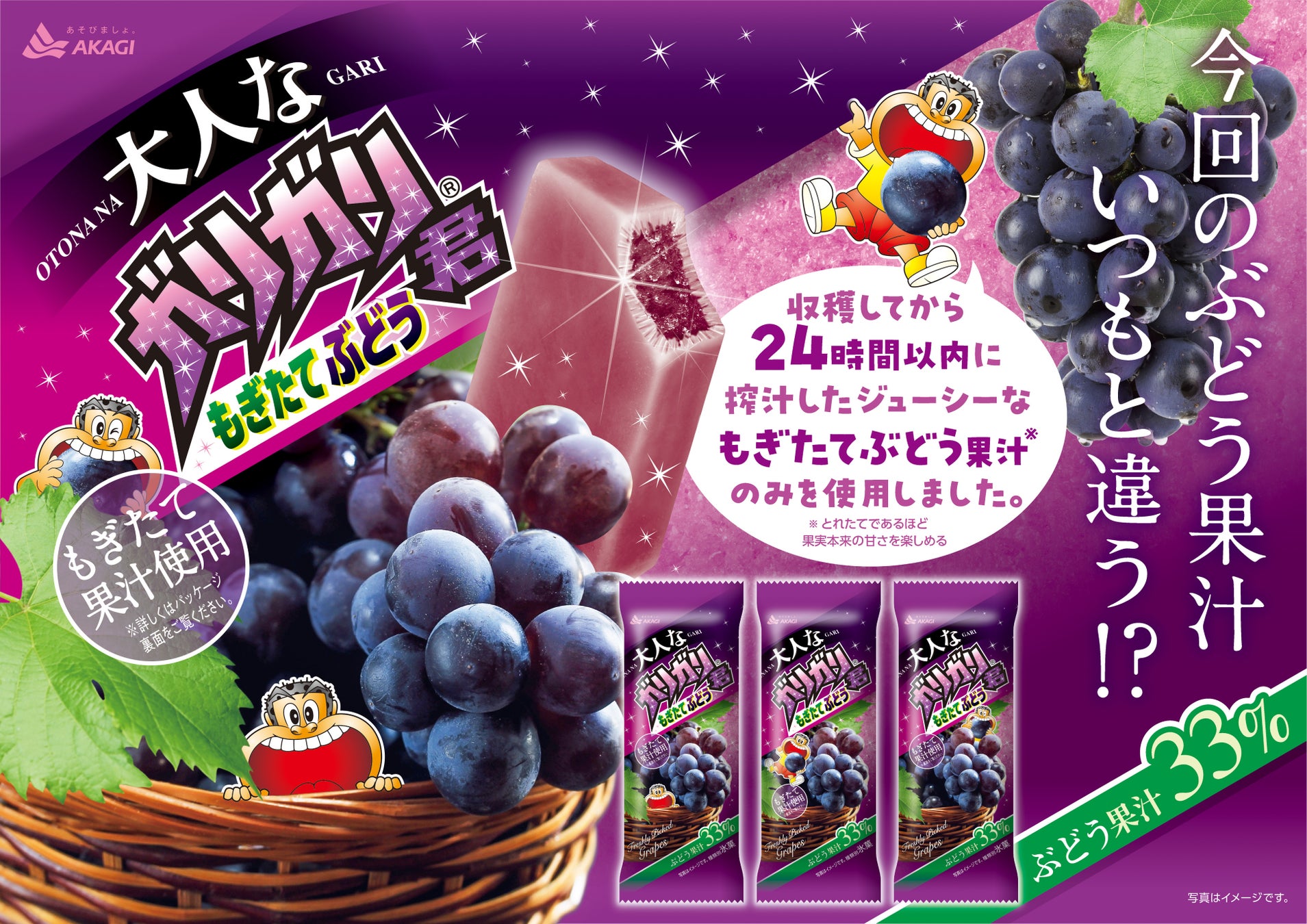 「大人なガリガリ君もぎたてぶどう」は、ぶどうアイスの中に、ジューシーなぶどうかき氷を入れたアイスキャンディーです。収穫して24時間以内に搾汁した、ジューシーなぶどう果汁のみを33%使用しました。ぶどうの豊かな味わい、美味しさをお楽しみください。