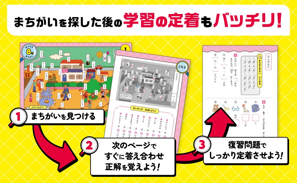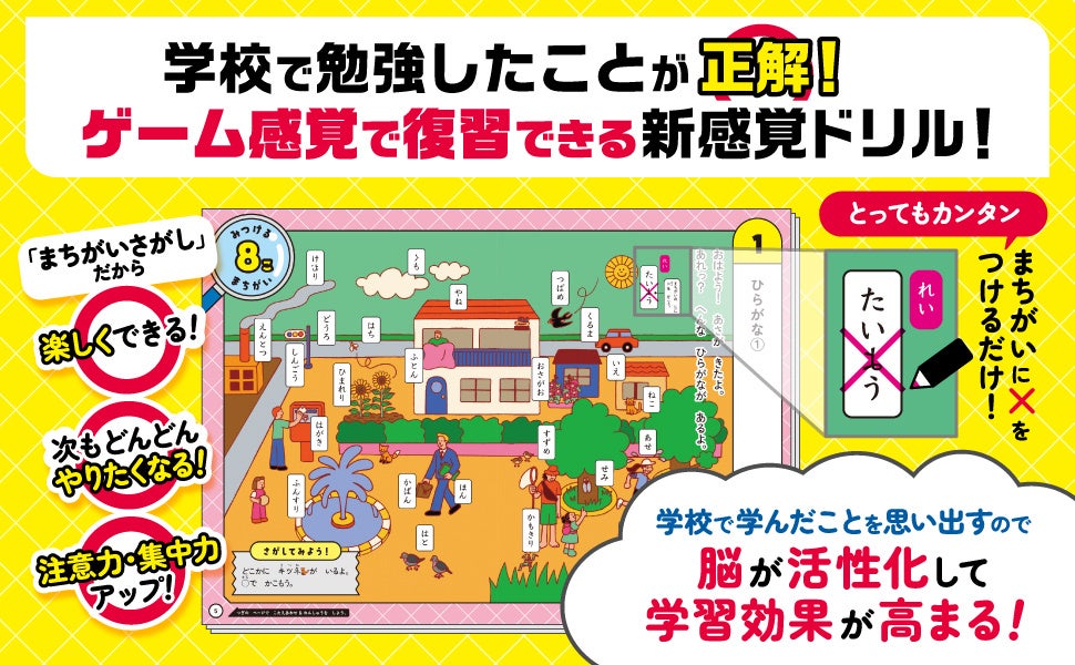 このドリルでは、学校で学習した内容を、まちがいさがし形式で復習します。好奇心を刺激する「まちがいさがし」で、お子さまが楽しみながら意欲的に勉強することができます。