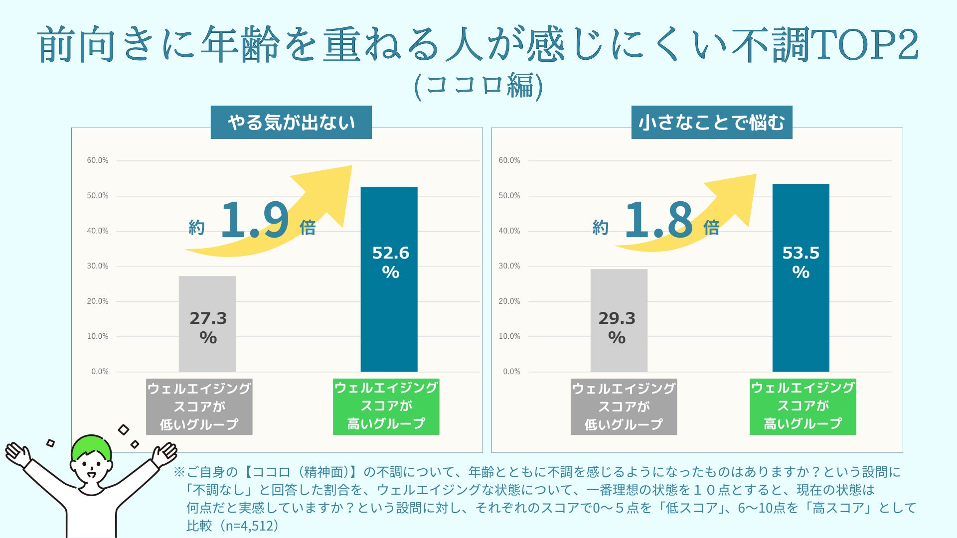 同じく、ご自身のココロ(精神面)の不調についての回答で、「不調なし」と選択した人の割合を、ウェルエイジングスコアが高いグループと低いグループで比較しました。グループ比較で「不調なし」の割合のギャップが大きい順に、1位:やる気が出ない(約1.9倍)、2位:小さなことで悩む、落ち込む(約1.8倍)と、カラダ同様大きな差があることがわかりました。