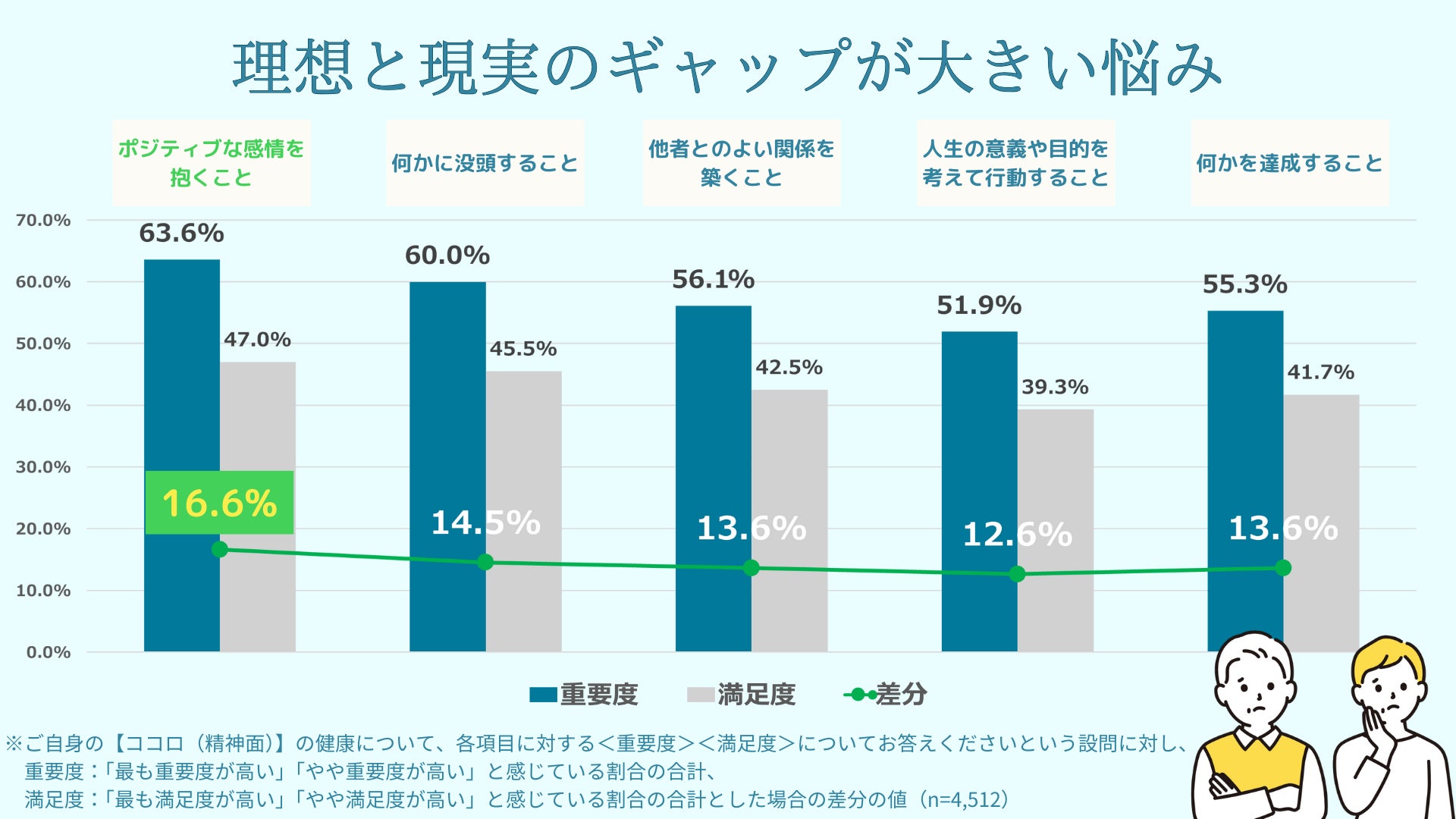 また健康に対する重要度と満足度を5つの指標で回答してもらったところ、理想と現実のギャップが大きい(重要度が高く、満足度が低い)TOPは「ポジティブな感情を抱くこと」(16.6%)となりました。
