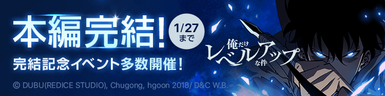 株式会社カカオピッコマ(本社:東京都港区、代表取締役社長:金 在龍)が運営する電子マンガ・ノベルサービス「ピッコマ」の看板作品である『俺だけレベルアップな件』(D&C WEBTOON Biz)の本編が1/21(金)をもって完結しました。ピッコマでは1/21(金)〜1/27(木)まで『俺だけレベルアップな件』本編完結イベントを開催いたします。また『俺だけレベルアップな件』作画担当「DUBU(REDICE STUDIO)」先生から本編完結記念イラストもピッコマ内で公開されております。