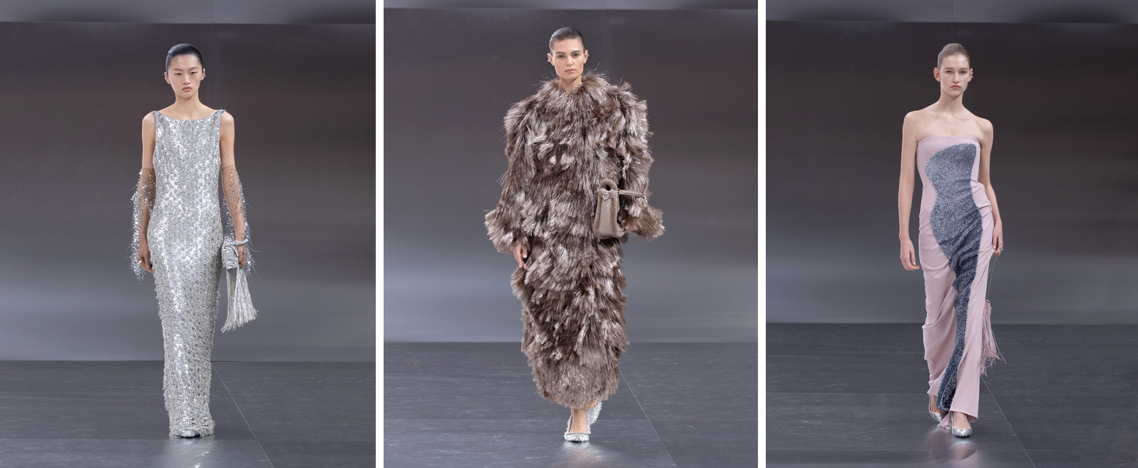 「僕は、カール・ラガーフェルド(Karl Lagerfeld)が抱いていたフェンディ(Fendi)のフューチャリズム(未来主義)について考えていました」とクチュールおよびウィメンズウェアのアーティスティック ディレクターを務めるキム・ジョーンズ(Kim Jones)は語ります。「このコレクションでは、身体、シルエット内のシルエット、人物、そしてクチュールの手仕事が、未来の中心にヒューマニズムを据えています。構造と装飾をテーマとし、この二つの要素は不可分に結びついています。僕は精密さと情緒を同時に表現したいと思いました」