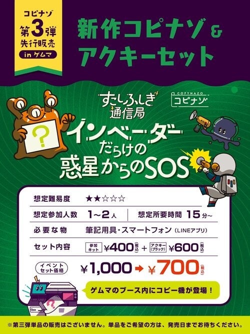 「コピナゾ」は、謎解きゲームを楽しめるサービスです。参加者の好きなタイミングで謎解きキットを購入し、遊ぶことが可能です。コピナゾシリーズの中で、『すこしふしぎ通信局』は参加場所を問わず、各家庭などで楽しめる謎解きを展開します。印刷したキットの他、LINEアプリを使用しながら謎を解き進めます。遠い惑星からの依頼の便りを、マルチコピー機を介し送る、すこしふしぎな通信局のお話です。