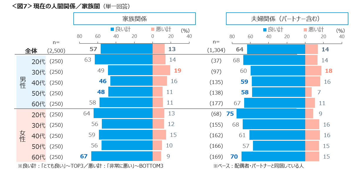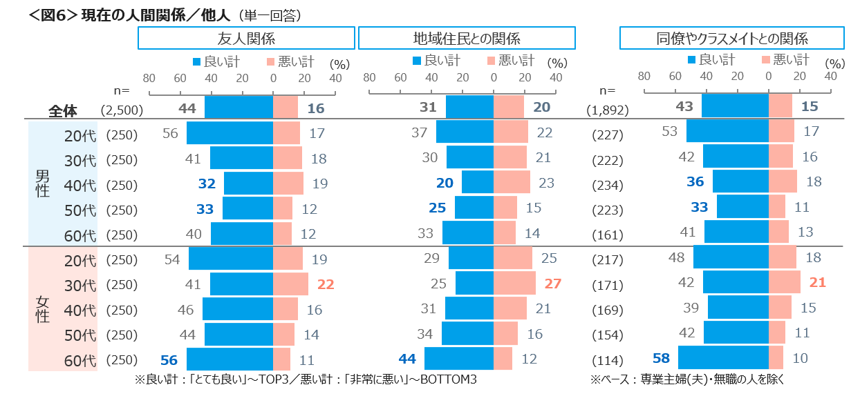 ストレスなどに影響をおよぼす人間関係を聴取したところ、”良い計”が高いのは「夫婦関係」「家族関係」と身内の関係であり、最も低いのは「地域住民」であった。女性60代はいずれの人間関係も良好の割合が最も高く、逆に、男性40代・50代は低い。一方、“悪い計(とても良い~非常に悪い/7段階聴取BTTOM3)”は、「友人関係」「地域住民」「同僚やクラスメイト」で女性30代、「家族関係」「夫婦関係」では男性30代の悪いとした割合が高かった。<図6、7>