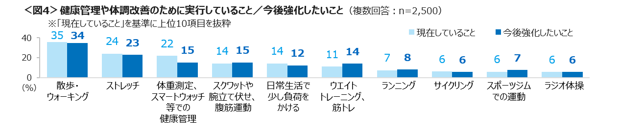 健康管理や体調改善のために現在実行していることは「散歩・ウォーキング」が35%と多く、次いで「ストレッチ」「体重測定、スマートウォッチなどでの健康管理」が20%台と比較的ライトにできる事柄が上位にあがった。現在行っていることと今後強化したいことの上位はほぼ同じ項目である。<図4>