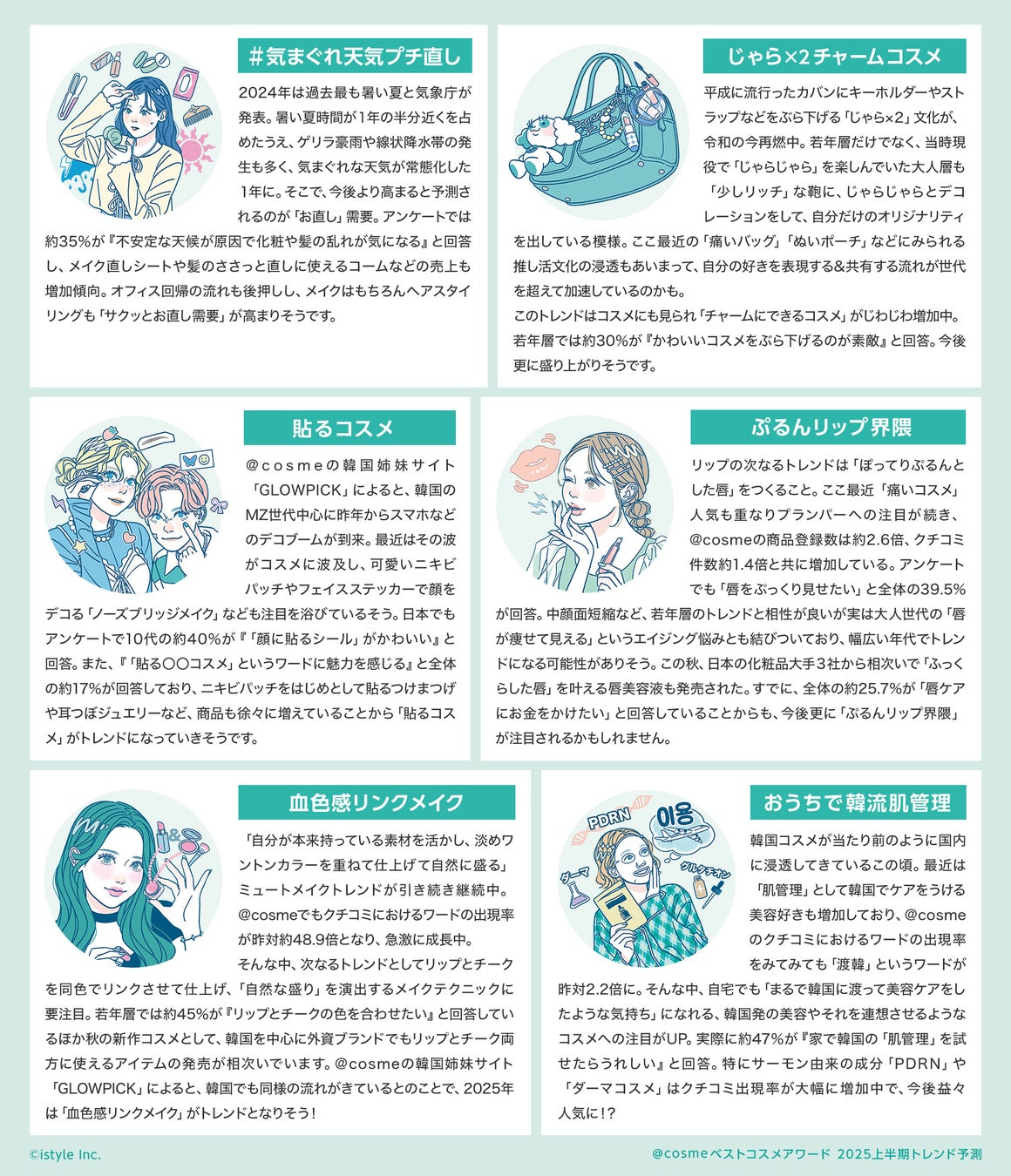 2025年上半期のトレンド予測は「#気まぐれ天気プチ直し」、「じゃら×2 チャームコスメ」、「貼るコスメ」、「ぷるんリップ界隈」、「血色感リンクメイク」、「おうちで韓流肌管理」の6つとなりました。