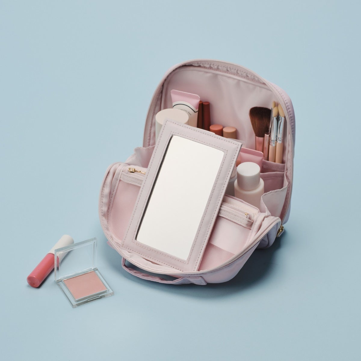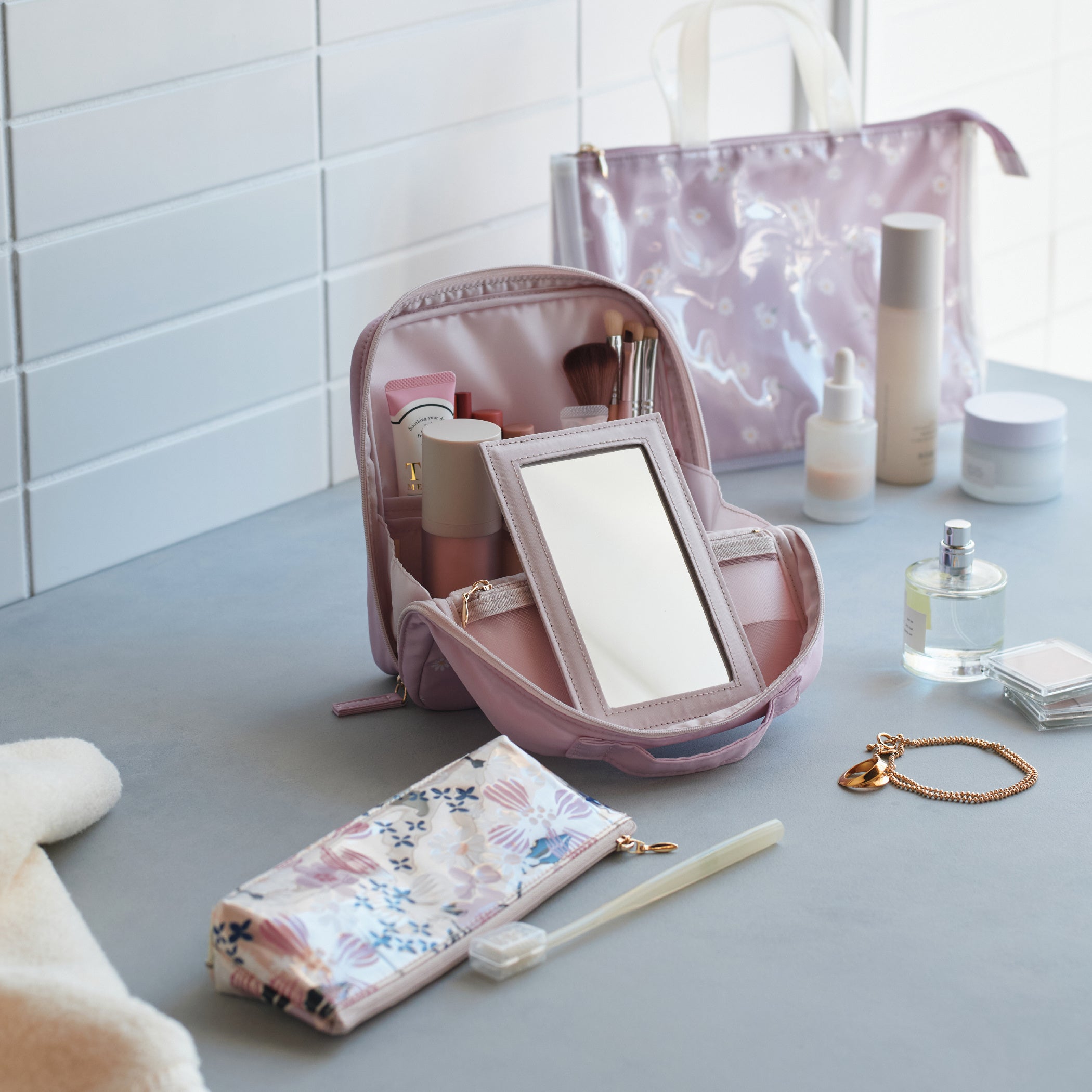 スキンケアやメイクアイテムをそのまま収納・持ち運びができる、ミラー付きの機能的なポーチ。ロゴ入りメタルパーツが洗練された印象で、付属の鏡を立てて外出先でも快適にメイクができます。