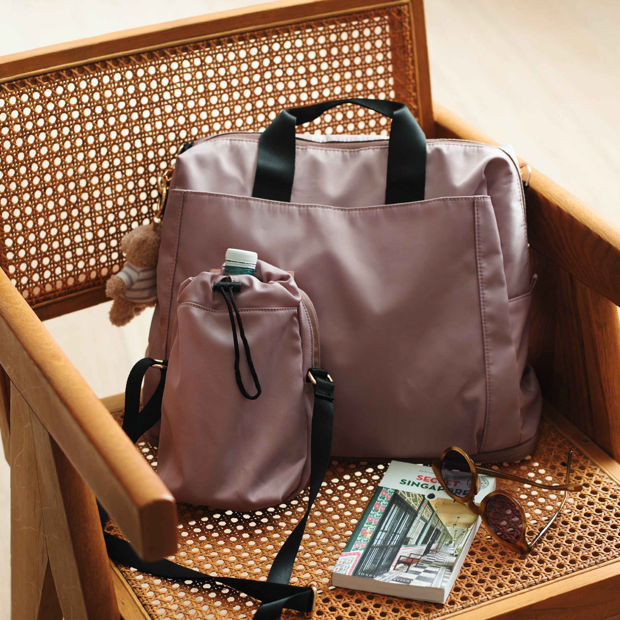 スーツケースの持ち手に装着してボトル類をまとめて持ち運べる便利アイテム。調節可能な紐とバックル仕様で、車のヘッドレストに取り付けたり、ショルダーバッグとしても活躍します。