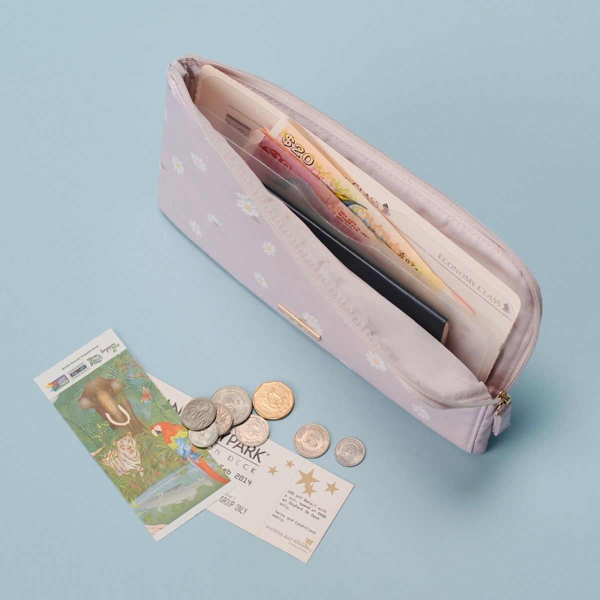 可動式のチケットホルダーを内蔵し、収納物の確認や取り出しを快適にサポート。国ごとに紙幣を整理できるため、海外旅行シーンに適した機能性の高いポーチです。