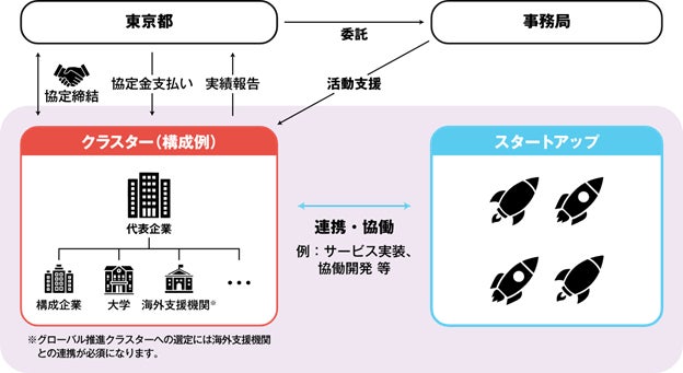本事業では、東京都の強みとなる様々な業界・分野やテクノロジーの領域において、イノベーションを巻き起こすため組成された複数企業からなるクラスターと東京都が、クラスターの専門領域においてスタートアップとの連携・協働を推進し、3か年で20件の協働案件の創出を目指します。こうして様々なプレイヤーが連携しながら、有望なスタートアップを発掘し、グローバルに活躍すべく支援することを目的としています。