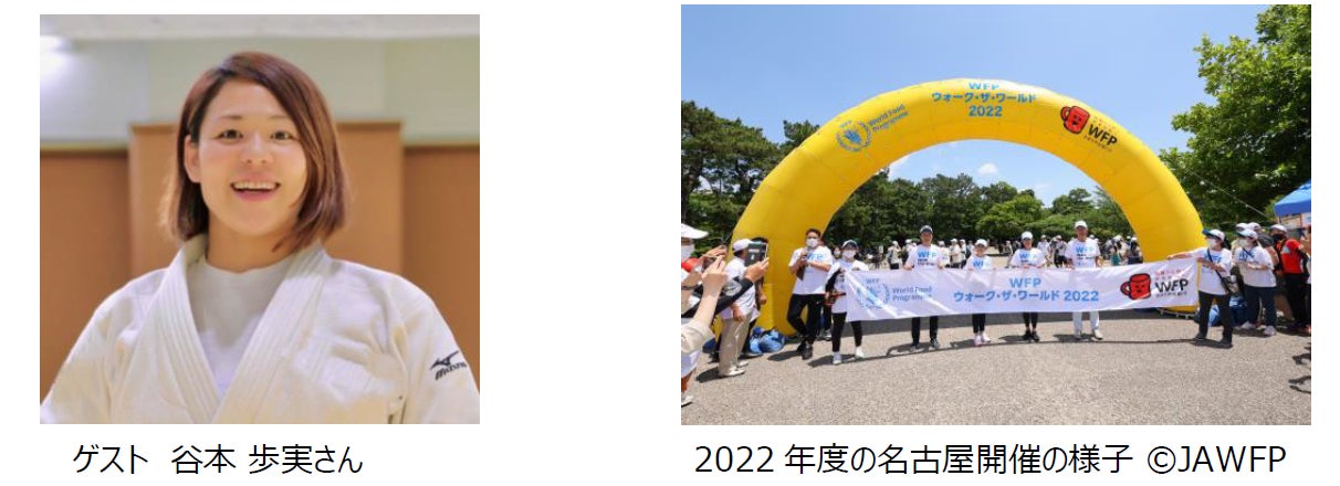 「WFPウォーク・ザ・ワールド」は、途上国の子どもたちの飢餓をなくすことを目的に、2005年から横浜でスタート。大阪でも2016年から実施し、名古屋では昨年の初開催に700人以上が参加。チャリティーへの意識が高まる中、今年で2回目の開催となります。ゲストは2004年アテネ五輪、 2008 年北京五輪で柔道五輪史上初のオール一本勝ちで 2 連覇を果たした柔道家、谷本歩実さん。参加者と共に歩いて子どもたちの支援を応援します。参加費の一部は、国連WFPの「学校給食支援」に寄付され、1人の参加(一般1,500円の場合)で、子ども1人の約33日分の給食を提供することができます。