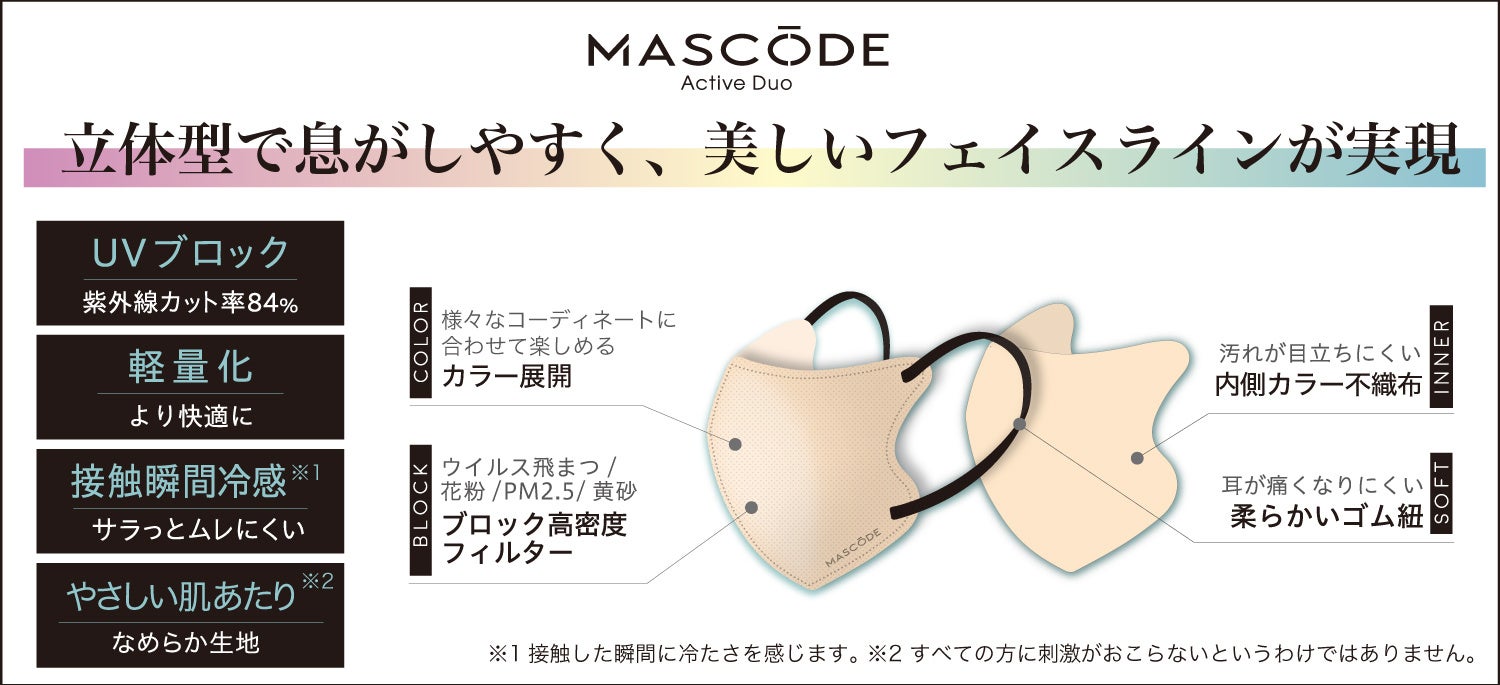 「MASCODE(マスコード)」は、ファッション性と機能性を両立させ、「マスクにドレスコードを」というコンセプトでTPOや服装、その日の気分に合わせてマスクを選び、組み合わせる新しい楽しみを提供してまいりました。そんな新たなマスクのスタイルを提案するブランドとして、「MASCODE ACTIVE DUOシリーズ」は会話が増えるシーンや、屋外でマスクを使用する場合の不快感をより軽減し、年中使える多機能マスクです。