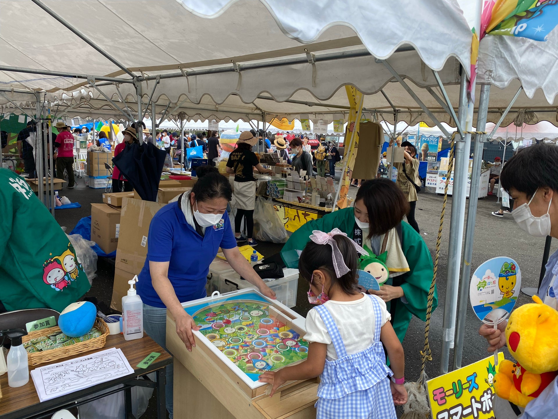 当イベントは、新型コロナウイルスの影響で中止が続いていましたが、今年は3年ぶりに開催されました。中四国最⼤級のご当地キャライベントで、日本全国から約70体のご当地キャラが須崎市に集結し2日間で約15,000人の来場者が訪れました。ダイナム高知須崎店、土佐店の従業員が運営に携わったダイナムブースには、約820名の方が訪れ、無料のゲーム(スマートボール・的あて)やモリスケとのフォトセッションを楽しんでいただくことで、地域の皆様との交流を深めております。