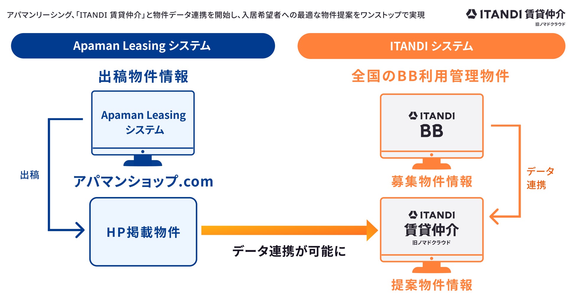 当社は、 2026年1月より、当社が提供する「ITANDI 賃貸仲介」と、アパマンリーシングの掲載物件データベースとのデータ連携を開始(以下「本連携」)しました。