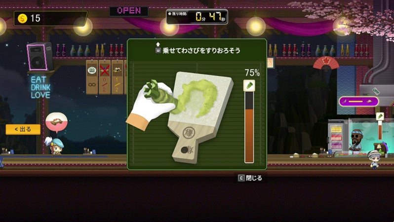 料理の提供以外にも、お茶の提供や片付け、わさびの補充など、営業中はたくさんの仕事をこなす必要があります。ゴールドを支払ってスタッフを採用し、効率的にお店を切り盛りしましょう。