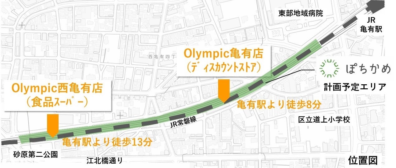 常磐線 亀有~綾瀬駅間の亀有方高架下空間を約800mに渡り順次開発を進めている高架下施設「ぽちかめ」に2023年7月21日(金)食品スーパー「Olympic西亀有店」がオープンします。