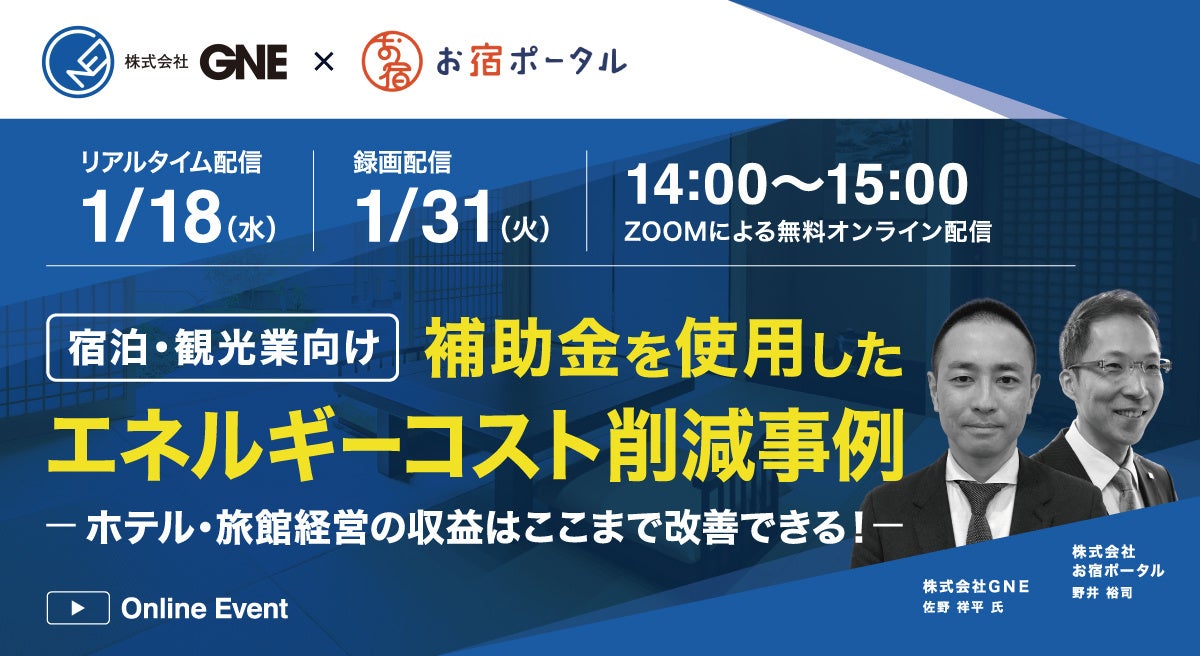 1月18日(水)、1月31日(火)※、株式会社お宿ポータルは、【株式会社GNE 執行役員 佐野 祥平氏】をお迎えして、宿泊・観光事業者向けに、補助金を使用したエネルギーコスト削減事例、ホテル・旅館経営の収益改善ポイントをお伝えするウェビナーを開催します。