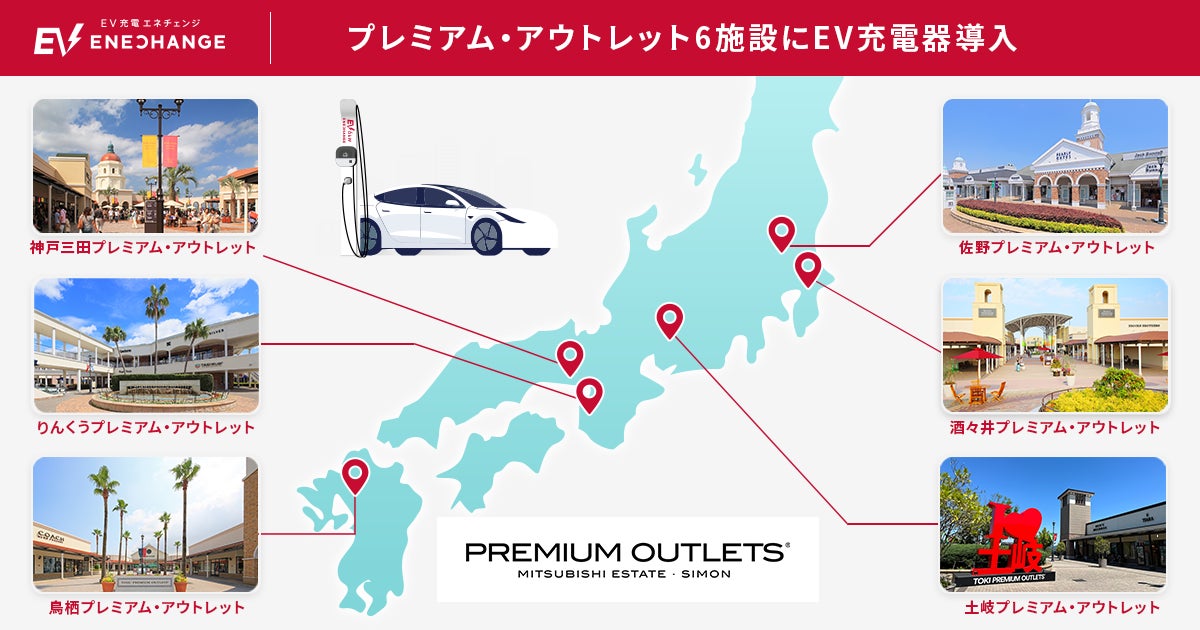 ENECHANGE(エネチェンジ)株式会社(本社:東京都中央区、代表取締役CEO:城口洋平、以下:エネチェンジ)は、プレミアム・アウトレット(運営:三菱地所・サイモン株式会社)6施設で、6kWの普通充電器を計12口設置したことをお知らせします。また、 2024年4月以降も追加設置の受託が決定し、ユーザビリティの高い「EV充電エネチェンジ」の導入で、サービス向上と脱炭素社会の実現に向けた貢献を共に推進してまいります。