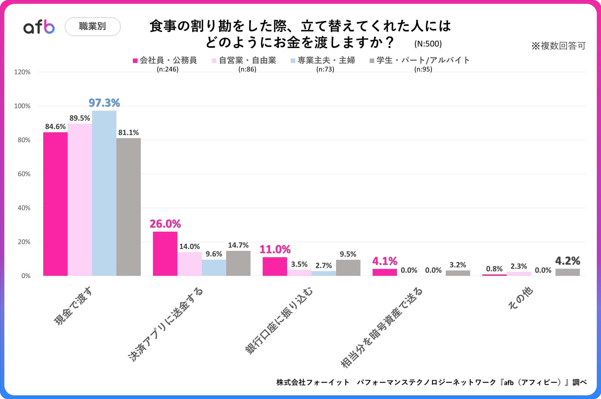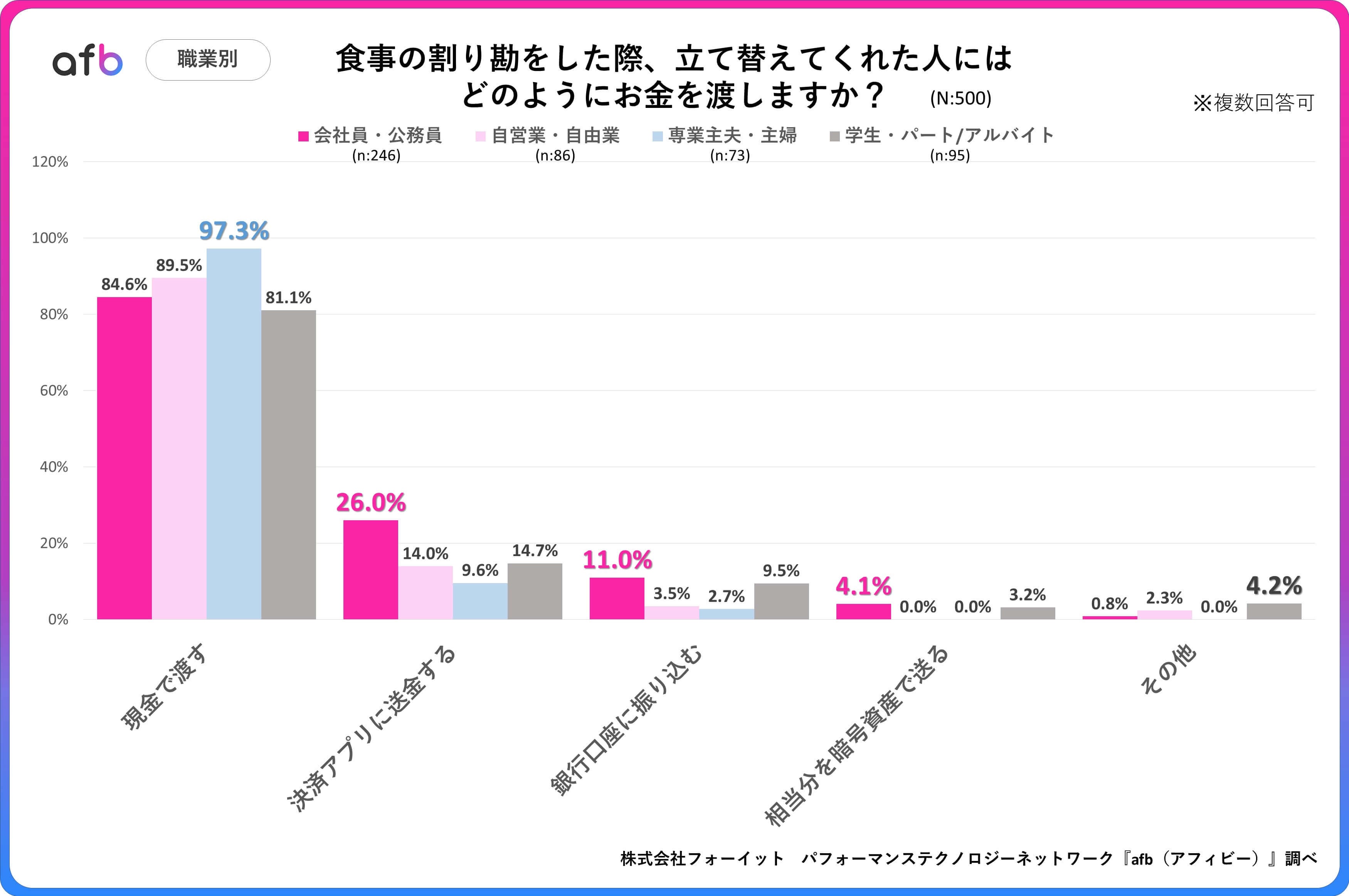職業別で見ると、「現金で渡す」と回答した方はどの職業でも80%以上でしたが、特に専業主夫・主婦では97.3%と高い結果になりました。日々の買い物や食費など、細かい出費をあらかじめ設定した予算内でやりくりするために、手元で物理的に管理できて分かりやすい現金でのやりとりが多くなっているということなのかもしれません。