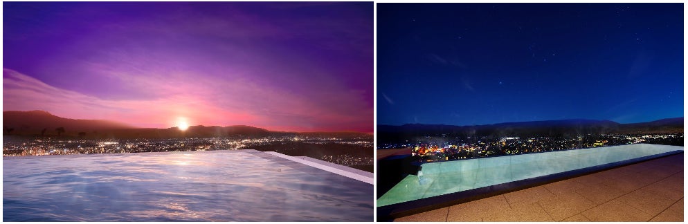 左:山の端に沈みながら、加賀の街並みを幻想的に染め上げる夕日を見ながら、非日常の湯あみを。