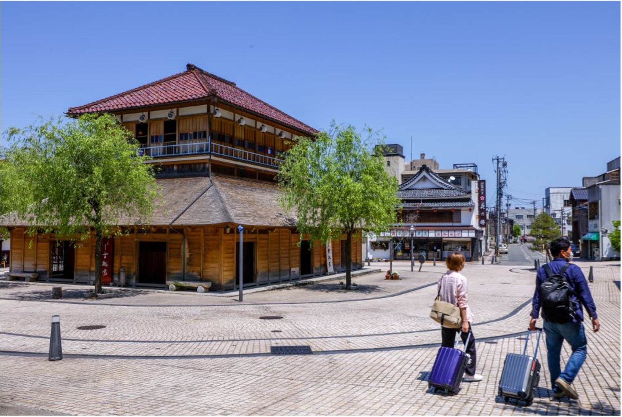 大江戸温泉物語Premium 山下家が建つのは、この山代温泉の象徴とも言える総湯の明治時代の姿を復元した「古総湯」、そして今も近隣の方が日常使いする公衆浴場「総湯」に隣接する、風情溢れる立地です。