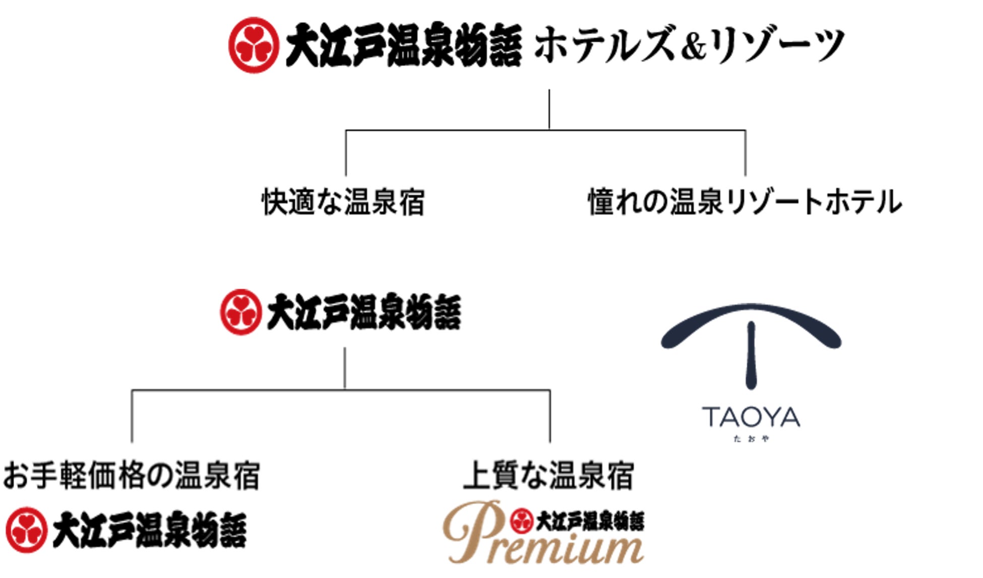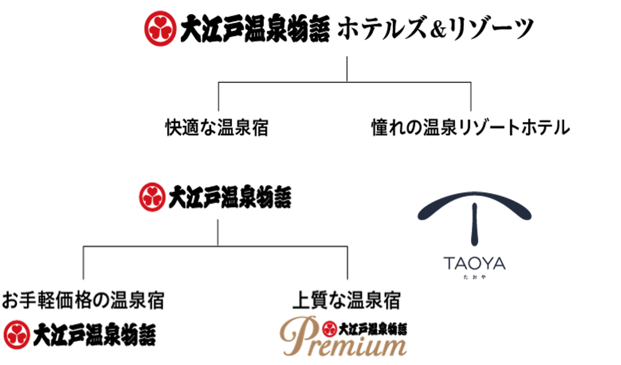 前述の「あいづ」をはじめとする手頃な価格で温泉旅をお楽しみいただける【大江戸温泉物語スタンダードシリーズ】、和モダンな雰囲気の中、上質な時間をご提供する【大江戸温泉物語Premiumシリーズ】、そしてワンランク上の滞在をご提供する温泉リゾートホテルブランド【TAOYA】に分類しております。