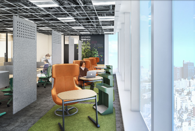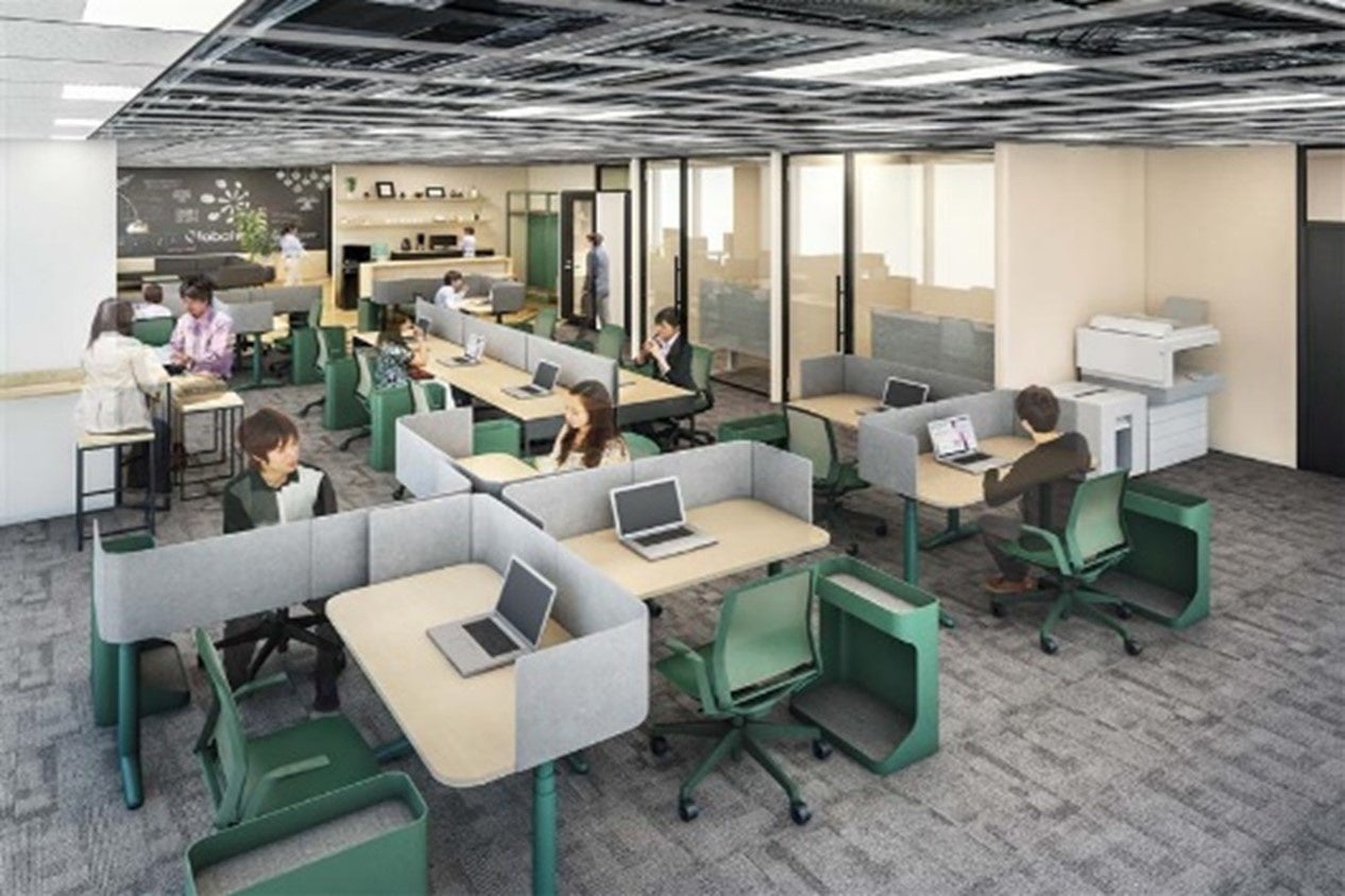 内装はコーポレートカラーのグリーンを基調とし、各所に植物を配置するなどナチュラルデザインを採用。「カフェのようなリラックスとコミュニケーションを促すエリア」「作業に集中するためのフルクローズエリア」「人の存在を感じつつも作業に集中するためのセミクローズエリア」など、必要な業務上の統制を念頭に置きながら、各自の状況に合ったオフィスでのワークスタイルが選択できるよう、各エリアのコンセプトを設計しています。