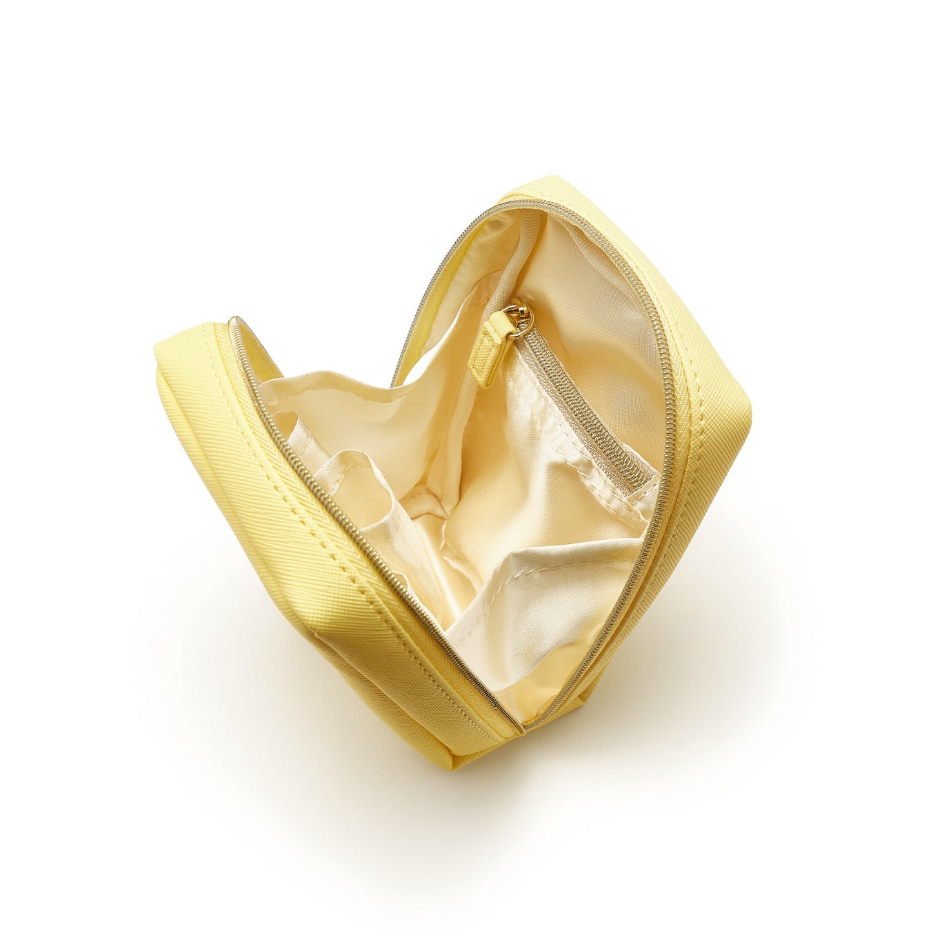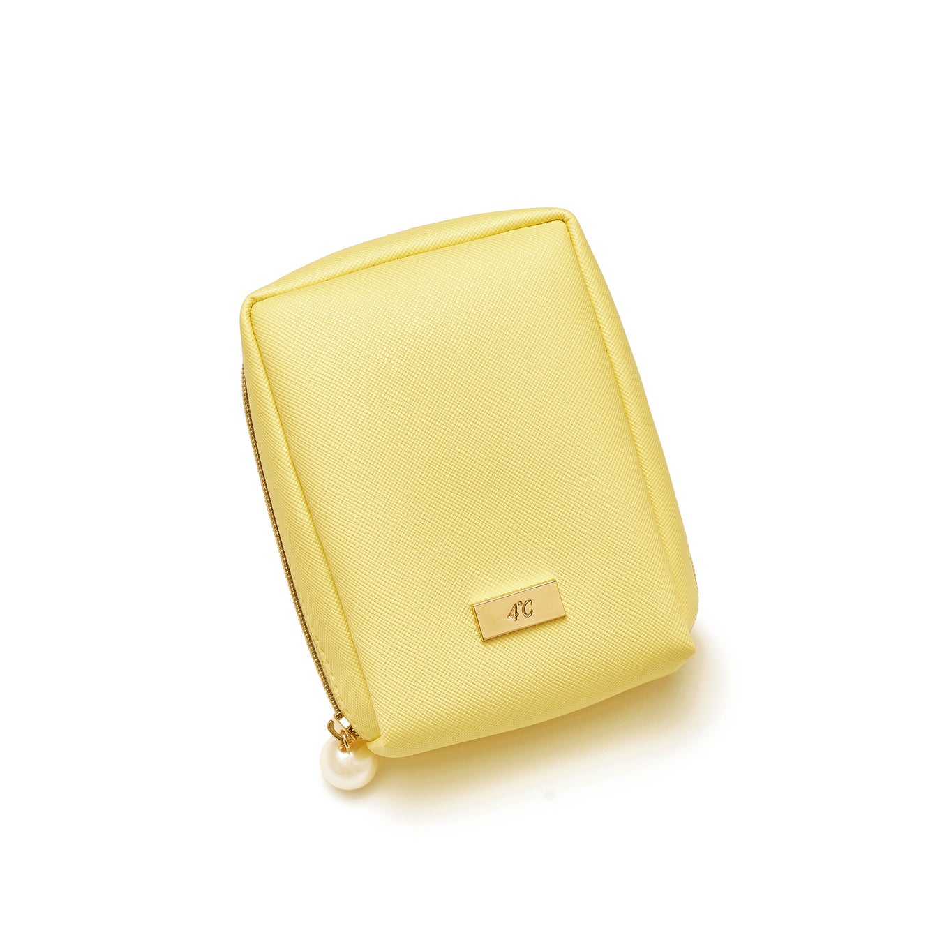 ファスナーの引き手には、ミモザジュエリーとリンクするパールをあしらい、内側には光沢のあるホワイトのサテン生地を使用。上品で春らしいデザインの特別なポーチです。