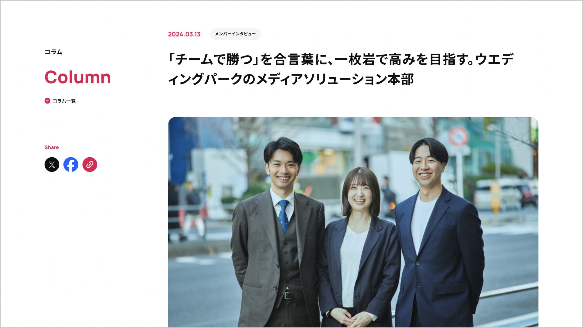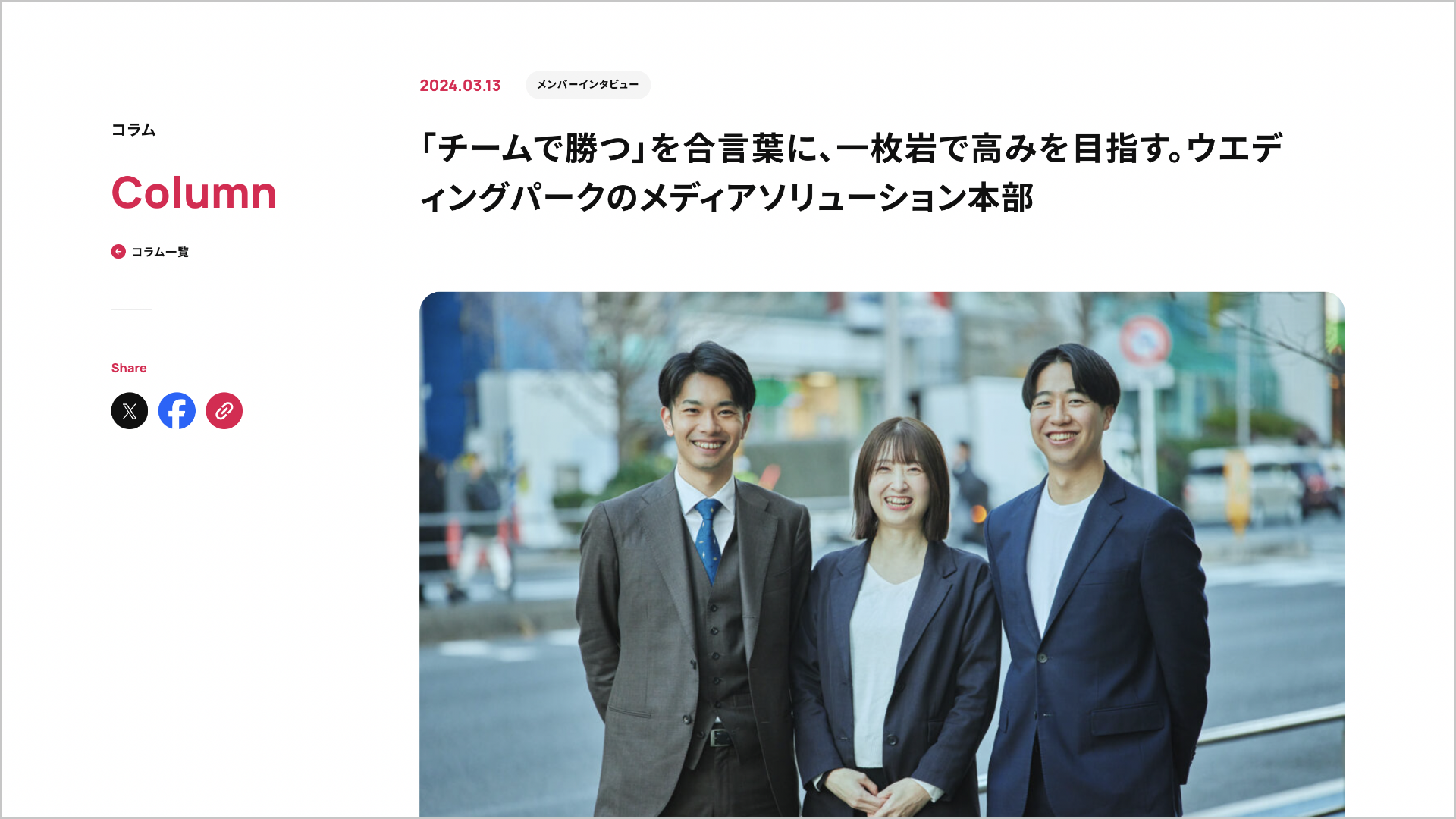 ウエディングパークの強みである「チーム力」にフォーカスした社員インタビュー記事を掲載。事業への想い、仲間とのリアルな関係性などチームウエディングパークの魅力をご覧いただけます。