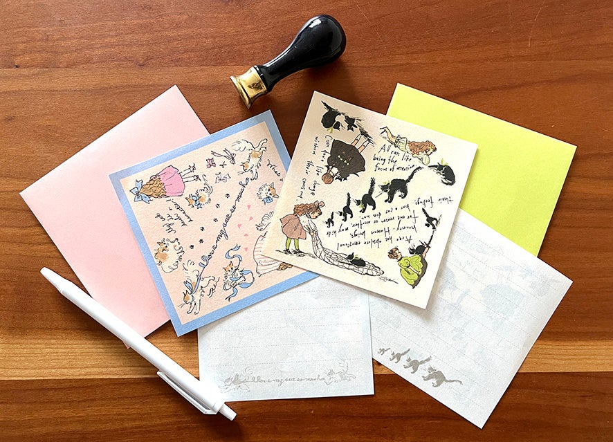 便箋8枚/封筒4枚入り。絵本のように可愛いスクエアサイズです。便箋は折らずに色紙の封筒に入れることができます。