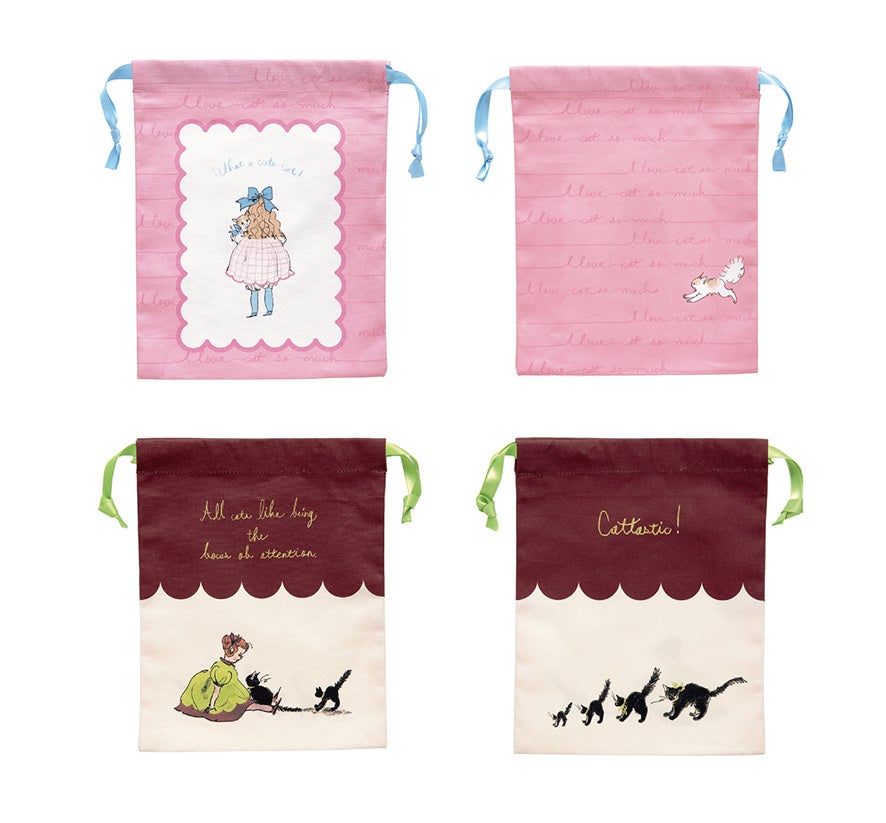 イラストに合わせたリボンの色がポイントの巾着です。小物の収納や旅行に便利なサイズです。