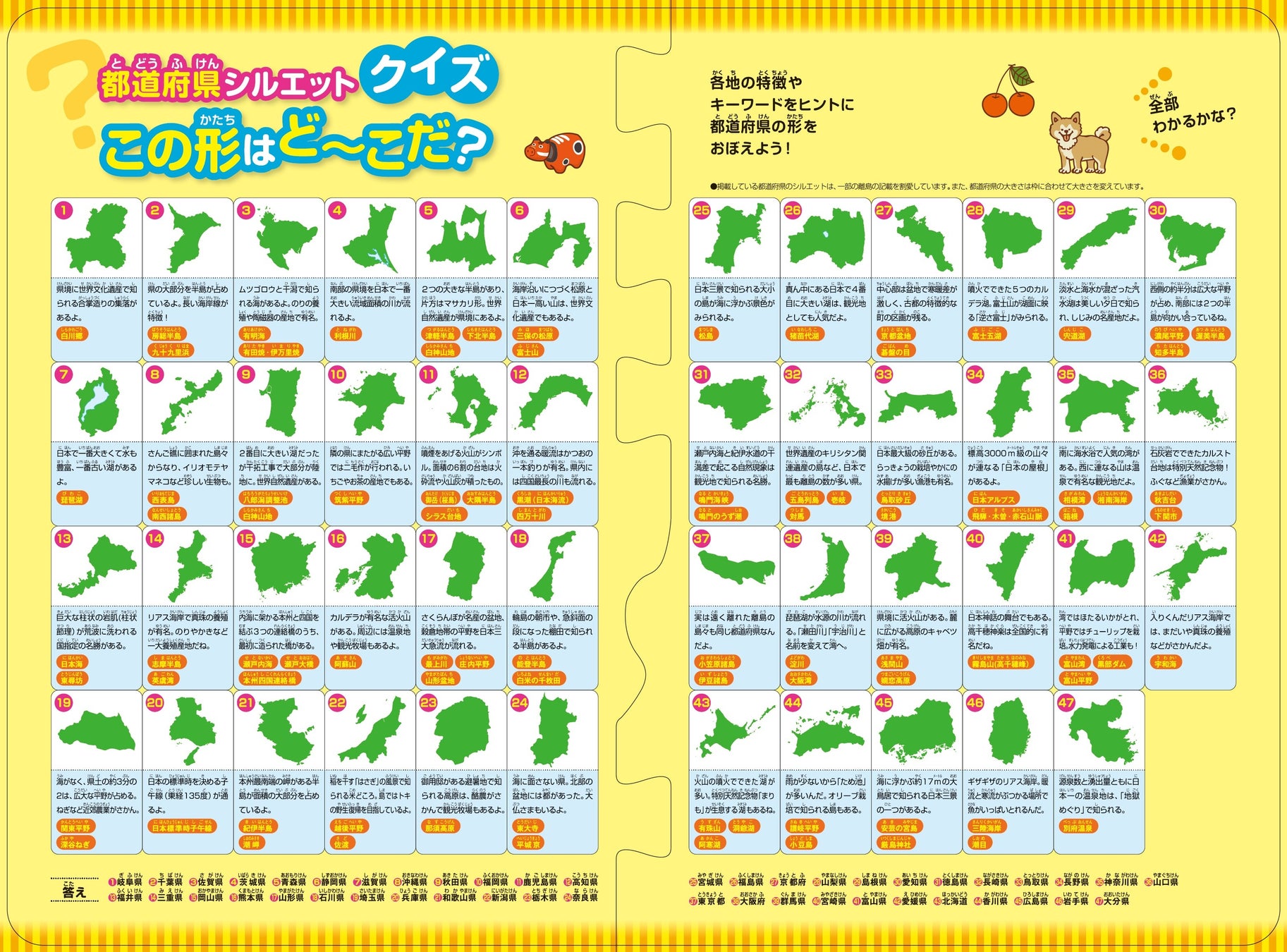 パズルの裏面で、都道府県シルエットクイズにチャレンジ!各地の特徴やキーワードをヒントに、きちんと覚えられたかおさらいができます。