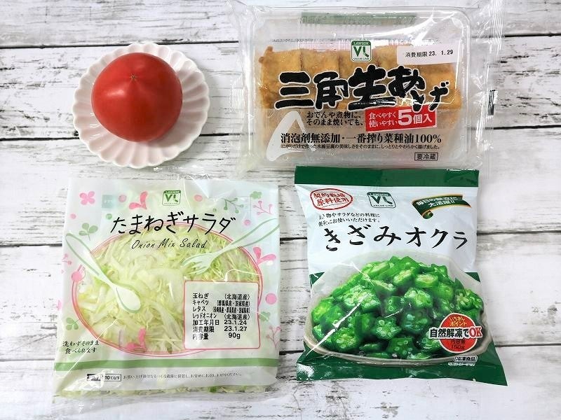 カット野菜は、和風の味わいによく合う『VLたまねぎサラダ』をチョイス。たまねぎ独自の風味とシャキシャキ感が、全体の味を引き締めてくれます。『VL三角生あげ』を口に入れた瞬間の食感も、このサラダのおいしさポイント。外側はサクッとしていて、中はしっとり。オクラのトロッと感も重なって、素材と食感のおいしさを感じられるメニューです。