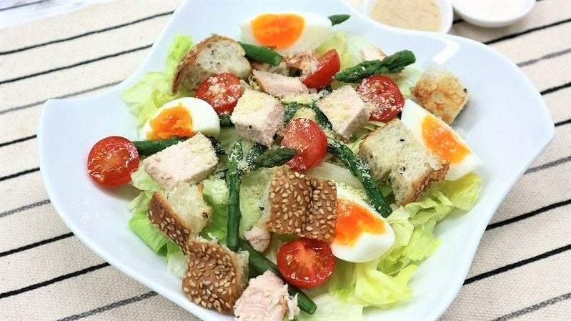 野菜やトッピング具材をカットして盛り付けるだけといっても、意外にもセンスが問われるサラダ。家で食べるからこそ、気分がパッと明るくなるよう、おしゃれに仕上げたいですよね。そんなときは、トッピング素材に変化を。パンやサラダチキンなど追加すると、カフェメニューのようなサラダが完成します。