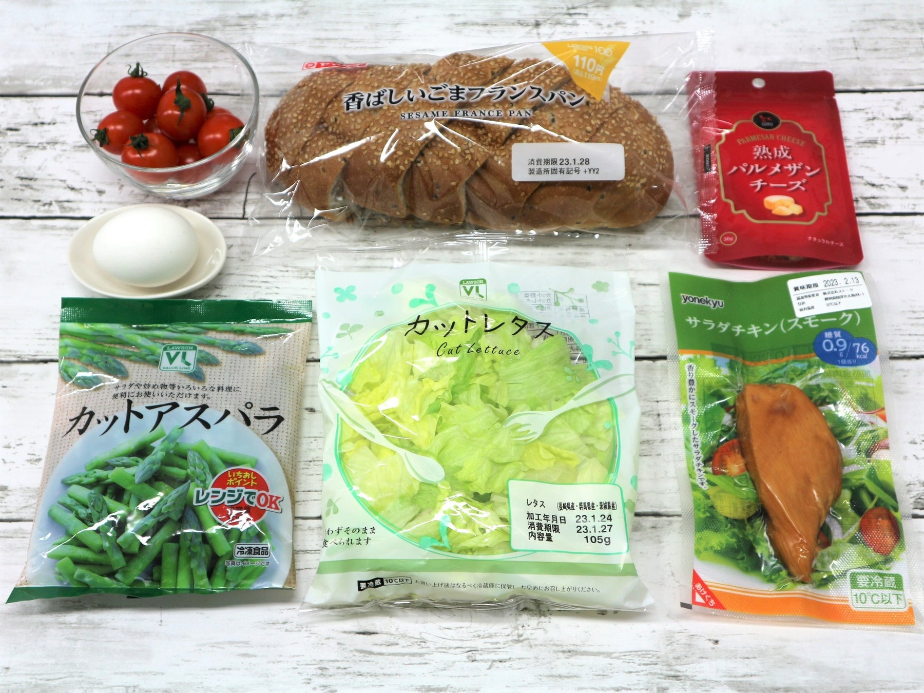 鮮やかな色合いと具材たっぷりなサラダは、やはり食欲をそそります。『香ばしいごまフランスパン』は、トーストするというひと手間がおいしさアップのポイント。サクッと軽快な食感とともに、ごまの風味が口いっぱいに広がります。また『サラダチキン』のスモーキーな味わいもアクセントに。食べ応えもあるためランチにもぴったりです。