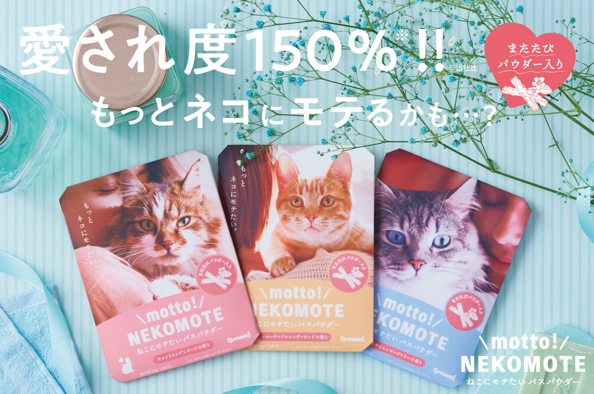 株式会社ドリームズ(本社:東京都新宿区/代表取締役 添谷徹)は、本物の「またたび」を配合した“猫にモテたい”バスパウダー『motto! NEKOMOTE(モット! ネコモテ)』を2023年10月16日(月)に発売します。【累計販売個数30万個突破!】2018年の発売以降、さまざまな猫系インフルエンサーにもご愛用いただき、多くの反響を呼んでいる“猫にモテたい”バスパウダー『NEKOMOTE』。新ラインナップでは、「キャットニップ×ローズ」「ハニーサックル×レザーウッド」「キャットタイム×ローズマリー」の3種の香りに、猫が好む「またたび」の粉末を配合。ほんのり優しいハーブの香りで、バスタイムの後は、いつもよりもっと猫に愛されるかも。2018年に発売した「NEKOMOTE BATH POWDER(ネコモテ バスパウダー)」と比較しても、猫ちゃんからの愛され度は、150%もアップ!(※当社比) 「入浴後は、愛しの猫ちゃんからもっと愛されちゃうかも…!」というワクワクするバスタイムを過ごすことができます。猫好きな方へのギフトにもぴったりのアイテムです。