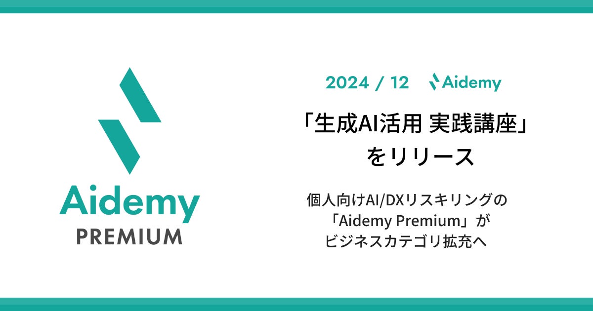 デジタル変革に伴走する株式会社アイデミー(本社:東京都千代田区、代表取締役 執行役員 社長 石川聡彦、以下「アイデミー」)は、個人向けAI/DXリスキリング「Aidemy Premium」において、業務でAIを活用するビジネスパーソン向けにビジネスカテゴリを拡充する方針を決定し、その第一段として2024年12月11日に新たに「生成AI活用 実践講座」をリリースいたしました。