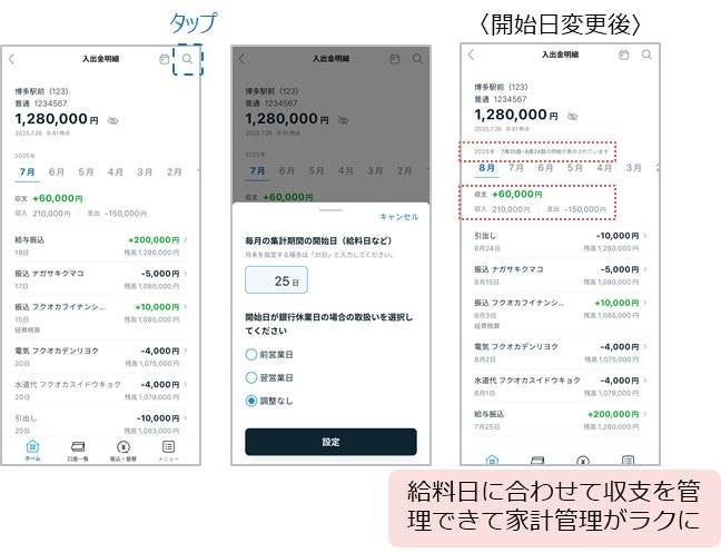 入出金明細の月間収支の計算開始日を給料日等に変更できるようになりました。開始日を25日に設定した場合、前月25日から今月24日までの収支が表示されます。