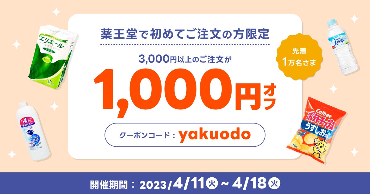 期間中、『出前館』から「薬王堂」の商品を初めてご注文される先着1万名さま限定!クーポンコード入力で3,000円以上の注文で1,000円オフのクーポンが利用可能となります。