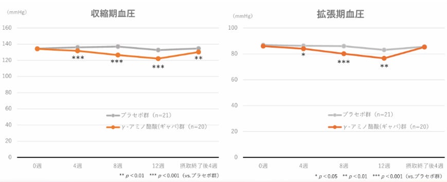 血圧が高めの健康な成人にγ-アミノ酪酸(ギャバ)を1日20mg摂取してもらったところ、収縮期血圧、拡張期血圧が有意に低下しました。